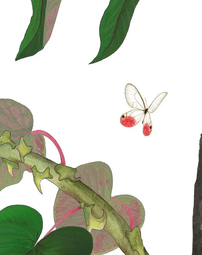 Collection: Ochroma Wild ThingsScale: LargeProduct code: 45Colourway: Bright WhiteWallpaper: The designs are printed on Uncoated Non-woven 147gsm.Roll dimensions:137cm x 12mArea: 16.44m2These designs are made up of 4 panels: A, B, C and D. The left edge of A meets the right edge of D. The wallpapers can be started with the panel of your preference, then keeping in this order: for example, CDABCD. The four panels are each up to 3m tall (minimum 240cm) which corresponds to the height of the area you want to paper. The tree can be positioned at the height on the wall that you desire, as there is enough earth and sky to be trimmable, according to your preference (white horizontal lines below are only an example).The first step should be to cut the roll horizontally, separating the panels. The second step is to remove the white edge vertically on at least one side of the design. This will allow pattern matching. Don’t worry about this being a rough cut, because both edges will be trimmed perfectly with the blade once they are in place on the wall.Pattern repeat: Half dropVertical repeat: NoneFire rating: Fire certified for both Europe and the USA. Classified to BS En 13501-1-1:2002, class B, s1, d0The Ochroma Wild Things design was done as a commission for the Max Planck Institute for Animal Behaviour to help their scientists feel more connected to nature when they are away from "the field". It attempts to evoke the environment on one of their research sites: Barro Colorado Island in Panama, with the water, islands and sky. The subject of this design is a remarkable phenomenon, studied by some their scientists, of multiple species of similarly sized mammals, as well as birds, reptiles and insects, exploiting the nectar of the Ochroma or balsa trees.The scenic background repeat in panels: A, B, C, and D, such that the left edge of A would match with the right side of D, so that the pattern can repeat seamlessly one roll to the next.The scenic design is itself unusual, but there is another unusual concept as well: in the foreground of each panel, we have a branching limb or tree, replete with leaves and buds and flowers and pods. This stylised tree is repeated on each of the four panels in almost an identical way. But each time it has different creatures occupying the branches and flowers and drinking at the ‘nectar bar’. Almost like a camera trap taking a series of images in one night. There are different colourways, referencing different nocturnal skies, as well one without colour in the sea and sky. This is an eco-friendly Fine gicleé digitally-printed “real” wallpaper. It is printed in the UK on a natural non-woven cellulose-based substrate made from recycled materials – recycled polyester (PET) fibre and recycled wood pulp. The production process is solvent free with minimal waste and energy inputs.