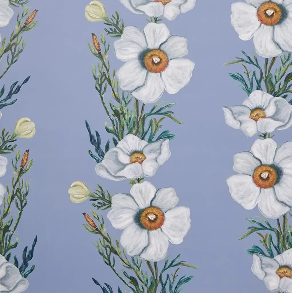 Stevie Howell Ojai Matilija Cornflower Blue Wallpaper is digitally printed with water-based inks on eco-friendly, clay-coated papers. In partnership with One Tree Planted, each wallpaper purchase supports reforestation efforts with a one-for-one business model. For each yard of wallpaper sold, we plant one tree to help clean our air and water, provide homes for wildlife, and contribute to our health and livelihoods. 1 yard of wallpaper = earth-friendly magic! Vertical repeat: 27" 27" wide trimmed paper (comes 30" untrimmed) Swatches are 8" x 10" 10 yard minimum 6 week production time Made in the USA Please note: All of our wallpaper is printed to order with a 4-6 week lead time, and we have a 10 yard minimum.
