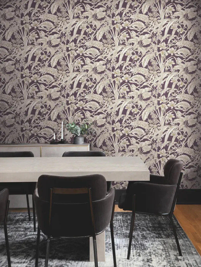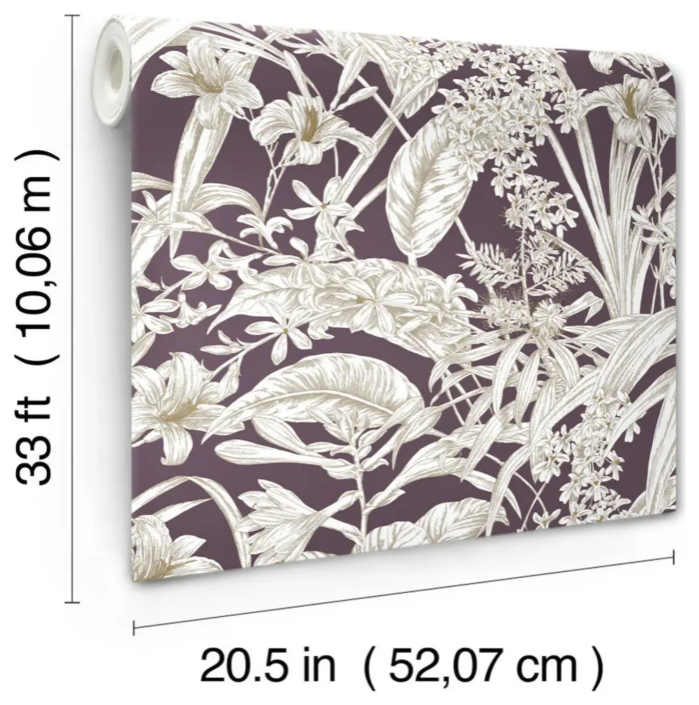 The tropical tranquility of Orchid Conservatory Toile is created with layers of white flora delicatly detailed with golden brown inks and metallic gold touches, allrichly offset by deep mulberry. This Orchid Conservatory Toile Wallpaper measures approximately 20.5 inches wide by 33 feet long, measuring approximately 56.4 square feet per roll. The quintessential design for timeless romance, toile traces its origins to 18th century fabrics. This celebrated motif is explored with a range of classical reproductions and modern reimaginings. Unpasted non woven material; 24-in repeat, drop match; Washable and strippable; 20.5-in by 33-ft long roll; Covers about 56.4 square feet