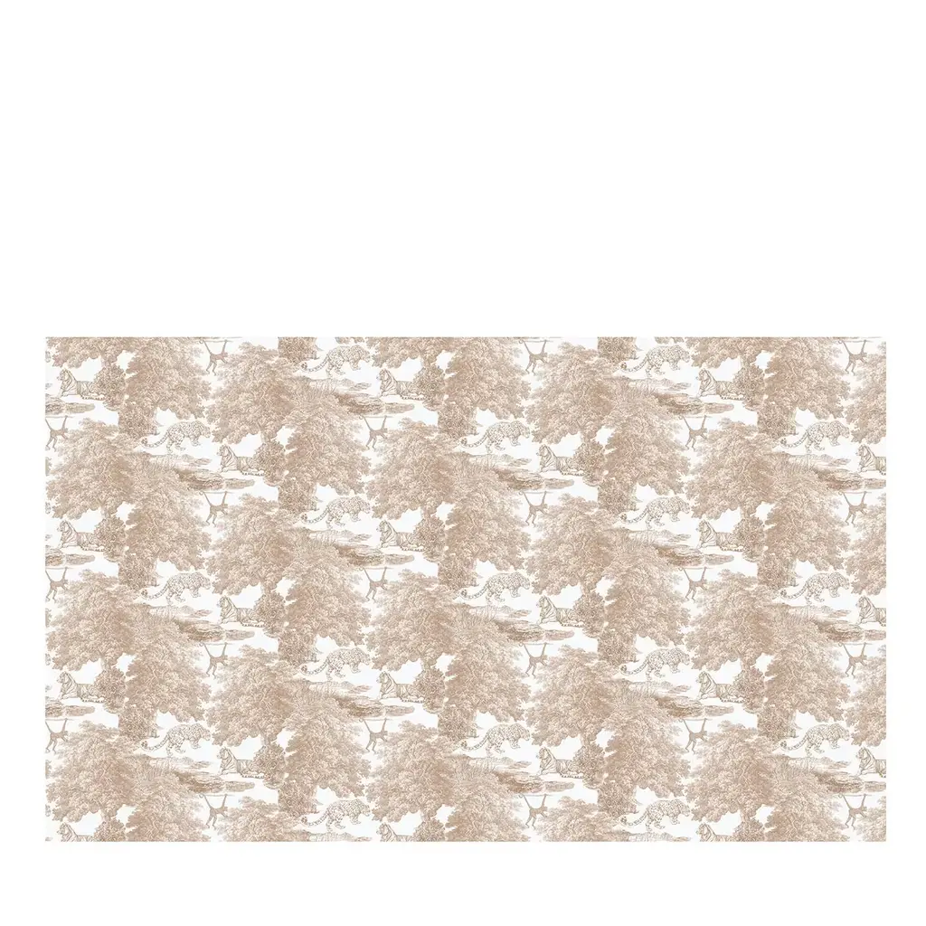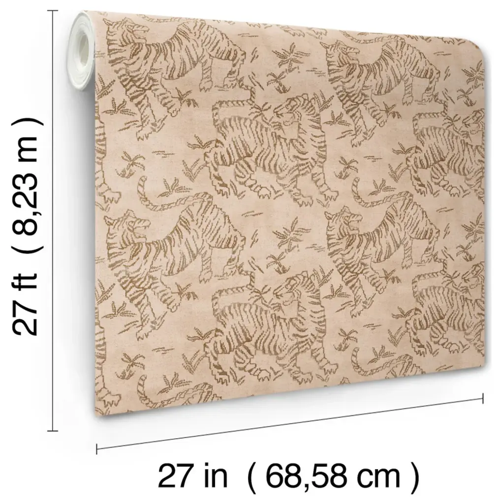 The heirloom prayer rugs of Tibetan monasteries inspired European tapestries such as the stylized rendering of Orly Tigers, shown in brown on blush pink. This Orly Tigers Wallpaper measures approximately 27 inches wide by 27 feet long, measuring approximately 60.8 square feet per roll. A retrospective from the private collections of Christiane Lemieux featuring global, artistic, and handcrafted designs. Unpasted non woven material; 24-in repeat, straight match; Washable and strippable; 27-in by 27-ft long roll; Covers about 60.8 square feet
