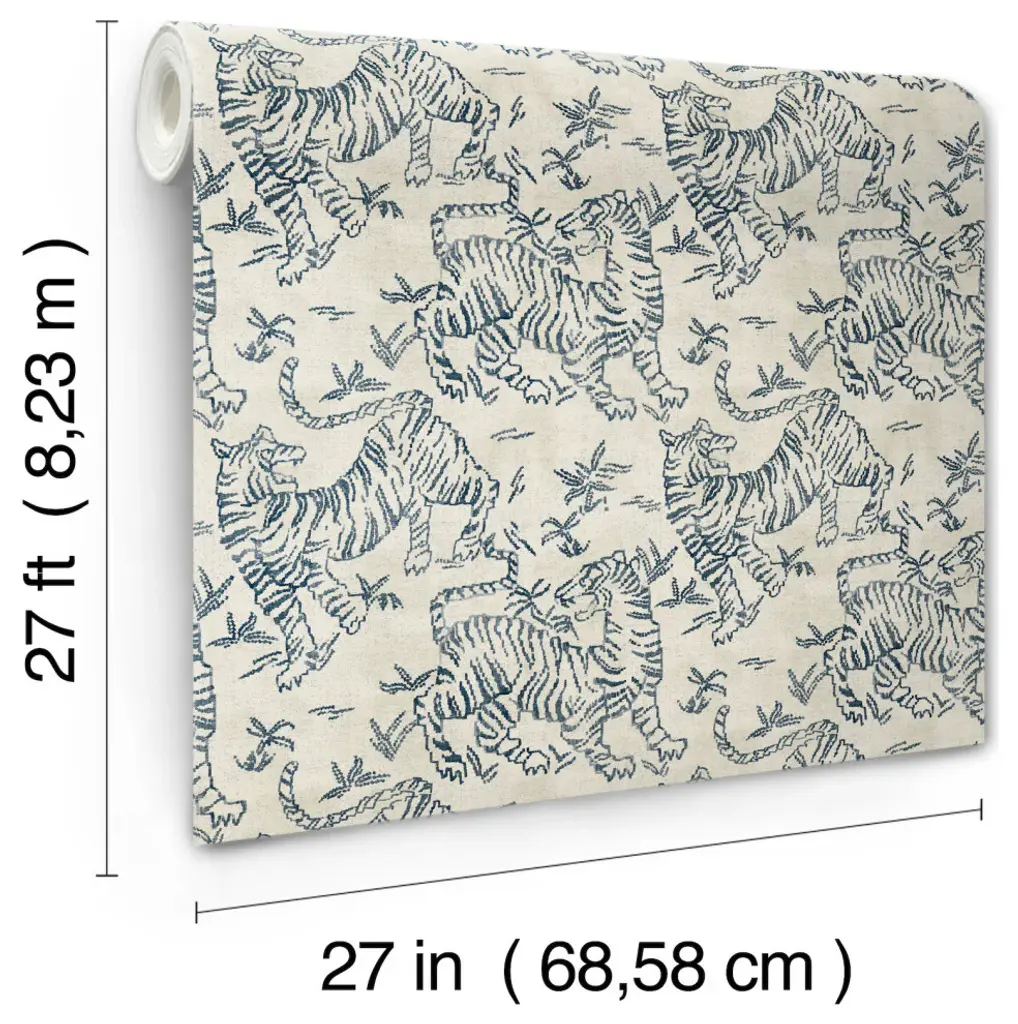 The heirloom prayer rugs of Tibetan monasteries inspired European tapestries such as the stylized rendering of Orly Tigers, shown in indigo blue on ecru. This Orly Tigers Wallpaper measures approximately 27 inches wide by 27 feet long, measuring approximately 60.8 square feet per roll. A retrospective from the private collections of Christiane Lemieux featuring global, artistic, and handcrafted designs. Unpasted non woven material; 24-in repeat, straight match; Washable and strippable; 27-in by 27-ft long roll; Covers about 60.8 square feet