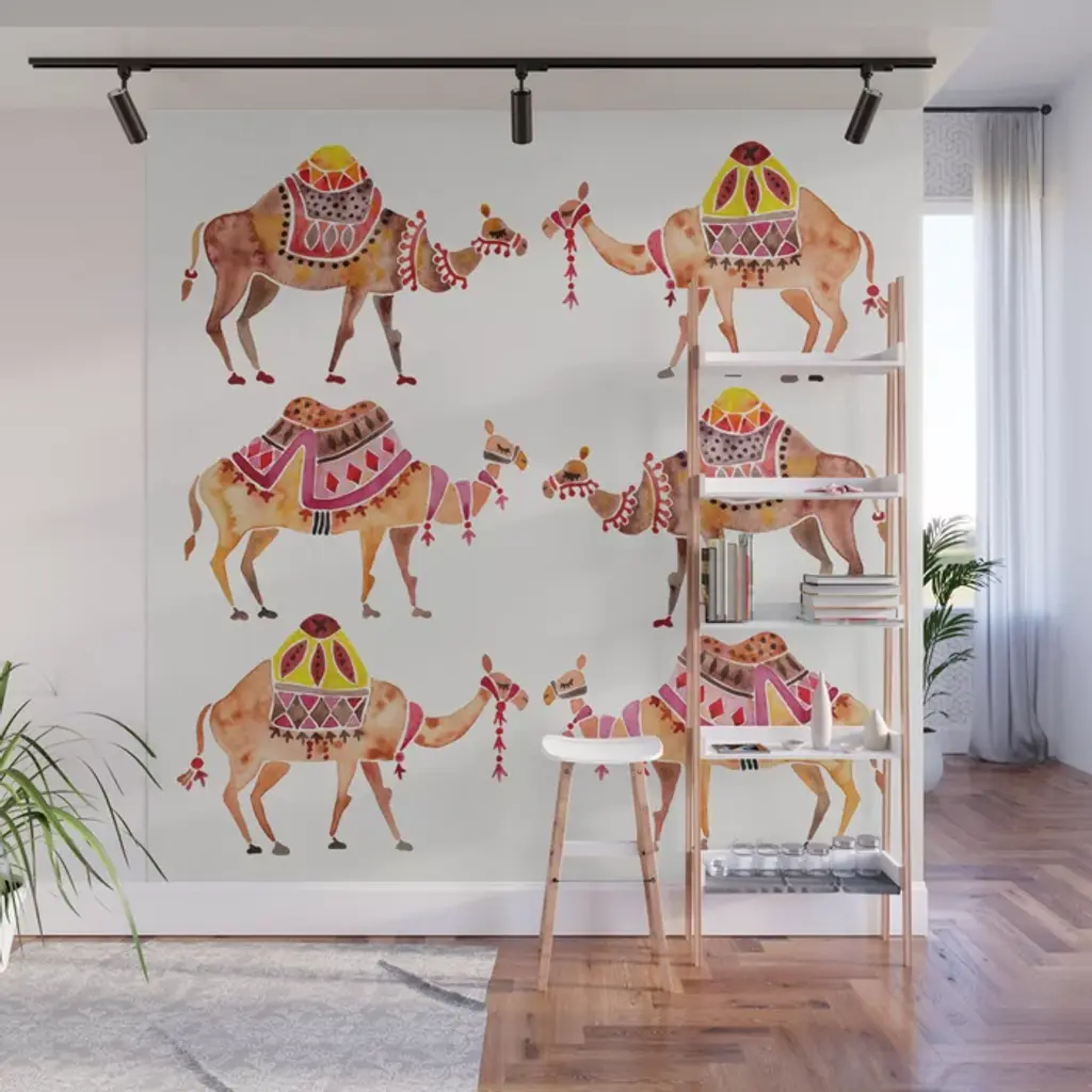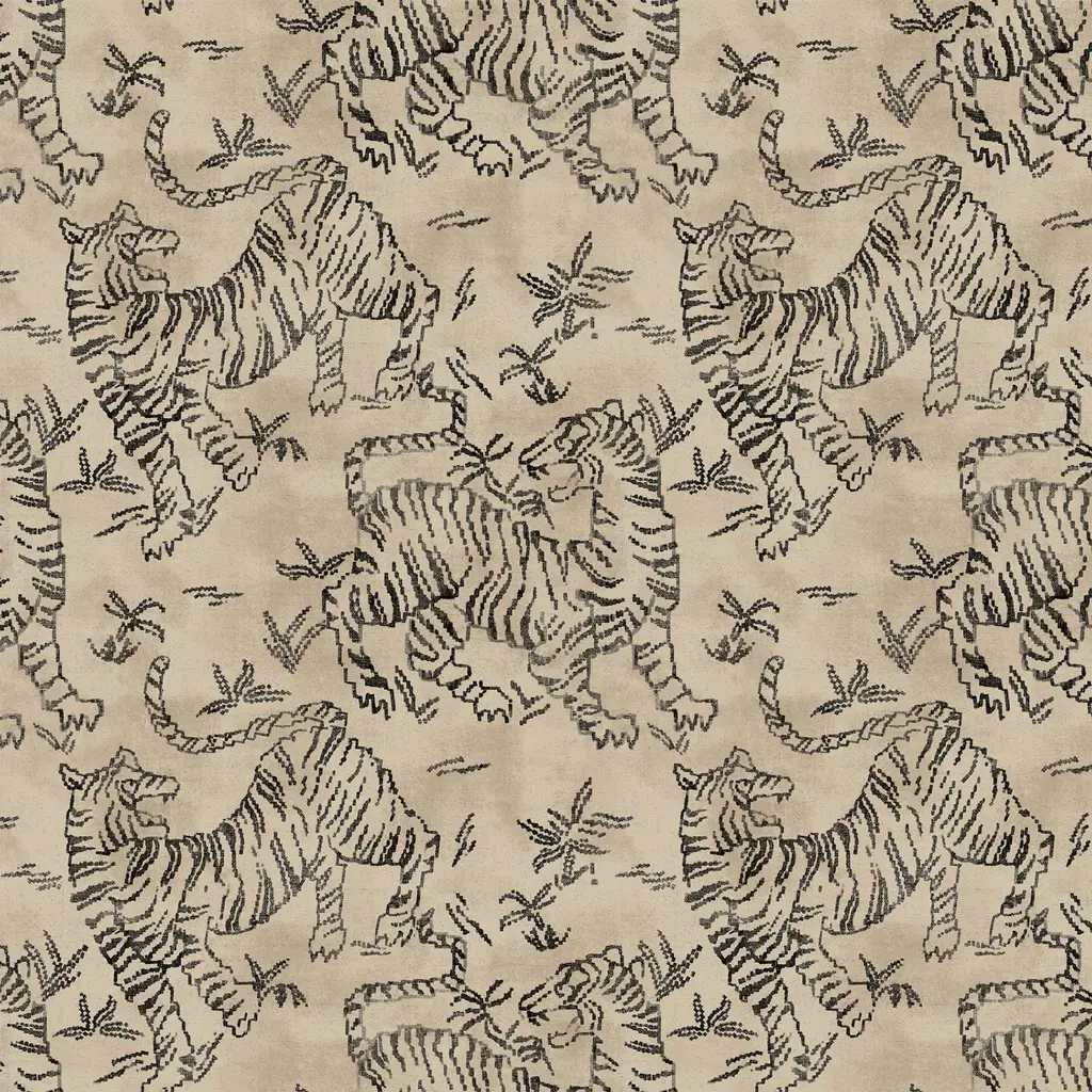 The heirloom prayer rugs of Tibetan monasteries inspired European tapestries such as the stylized rendering of Orly Tigers, shown in charcoal gray on taupe brown.