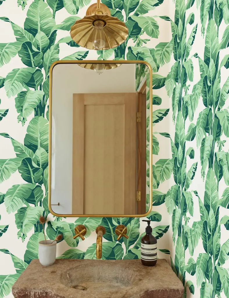 Take your walls from blah to California dreamy with this palm-print wallpaper from the exclusive collection by interior designer Nathan Turner. The illustrated effect and bold, colorful design create a trend-forward look.