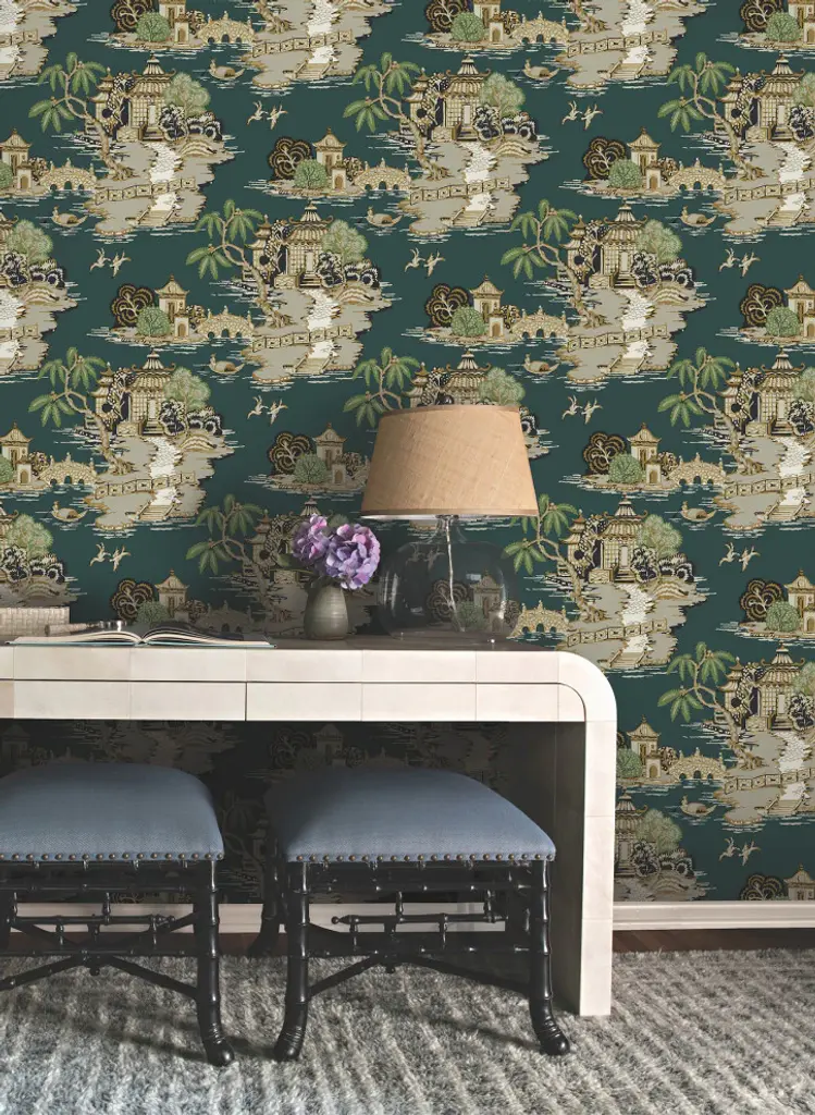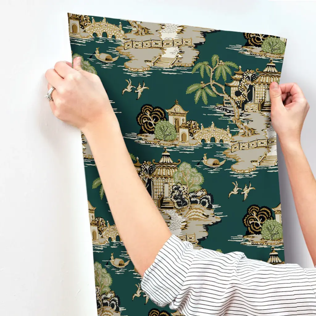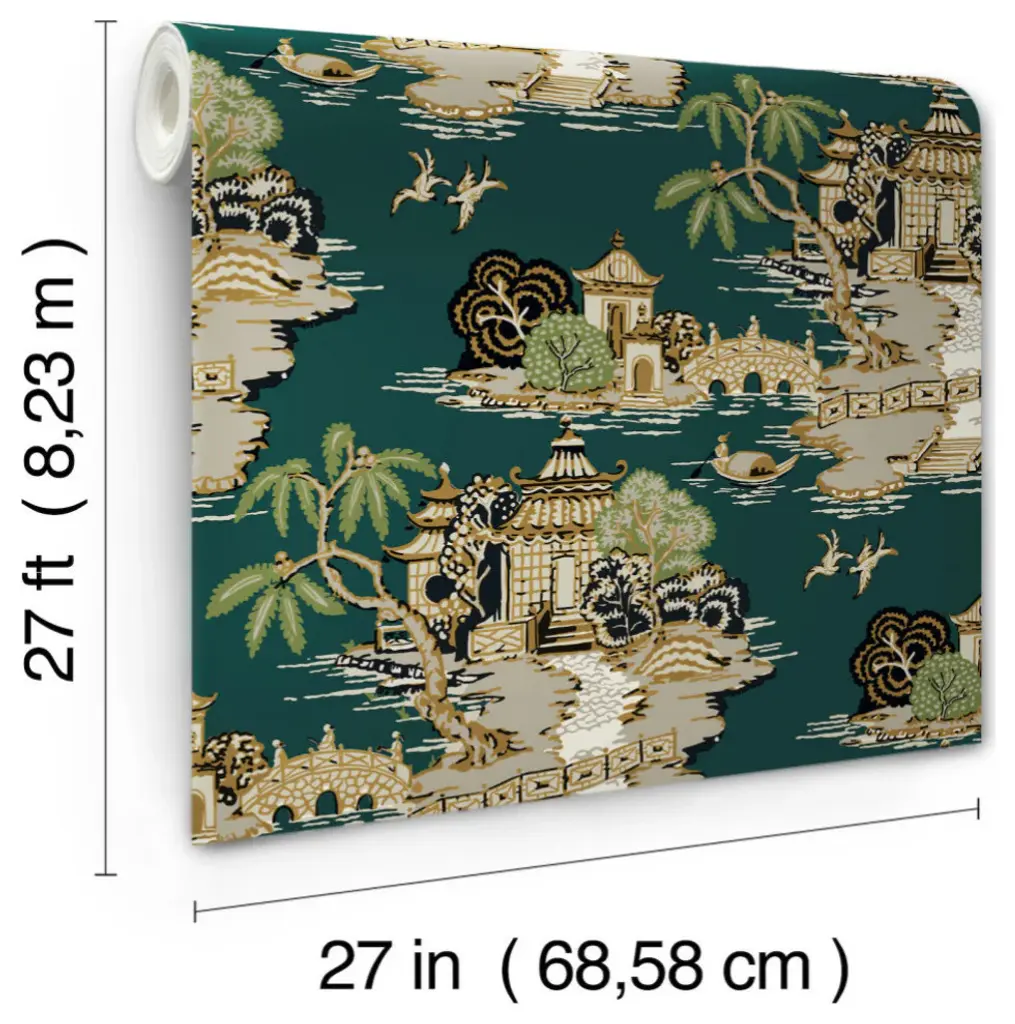Peaceful Pagoda and Sampan Scenic features idyllic East Asian riverscapes painted in shades of beige, metallic gold and leaf green against dark emerald green. This Pagoda And Sampan Scenic Wallpaper measures approximately 27 inches wide by 27 feet long, measuring approximately 60.8 square feet per roll. The quintessential design for timeless romance, toile traces its origins to 18th century fabrics. This celebrated motif is explored with a range of classical reproductions and modern reimaginings. Unpasted non woven material; 25.25-in repeat, straight match; Washable and strippable; 27-in by 27-ft long roll; Covers about 60.8 square feet