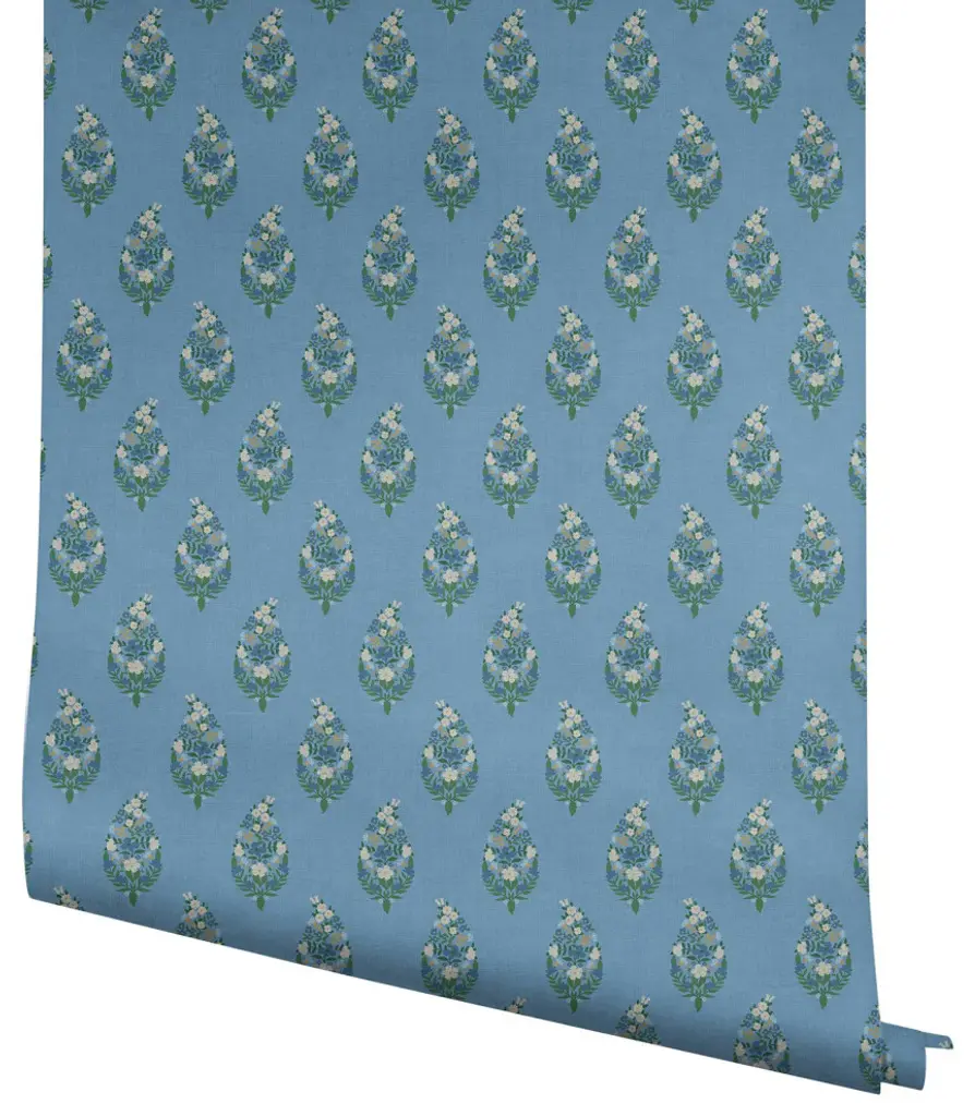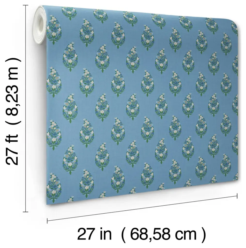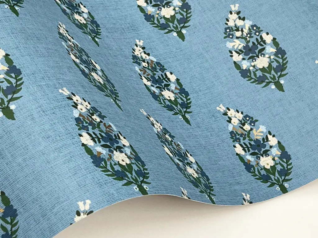Paisley offers a fresh take on the timeless pattern with the teardrop form composed entirely out of petite flowers framed by ferns. The flora is inked in shades of white, blue, yellow, and forest green against a sky blue backdrop with linen detailing. This Paisley Wallpaper measures approximately 27 inches wide by 27 feet long, measuring approximately 60.8 square feet per roll. The world of Rifle Paper Co. is in full bloom with their third wallpaper collection. With statement floral prints, detailed illustrated designs, and metallic accents, this collection is designed to bring beauty to every room. Unpasted non woven material; 25.25-in repeat, straight match; Washable and strippable; 27-in by 27-ft long roll; Covers about 60.8 square feet