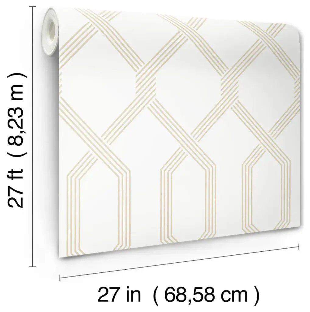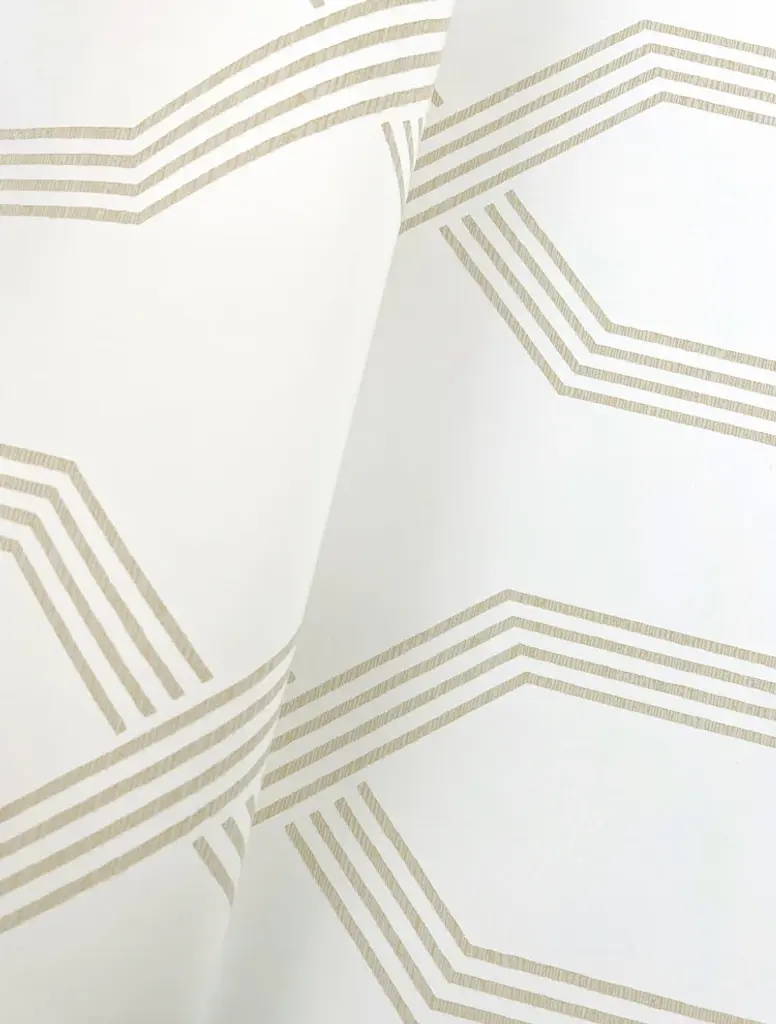 Oversized diamonds within Palisade form as the geometric crossing of lines twist into a ribbon of angled stripes, shown in beige neutrals on white. This Palisade Wallpaper measures approximately 27 inches wide by 27 feet long, measuring approximately 60.8 square feet per roll. The distinction of timeless style. Unpasted non woven material. 25.25-in repeat, straight match. Washable and strippable. 27-in by 27-ft long roll. Covers about 60.8 square feet
