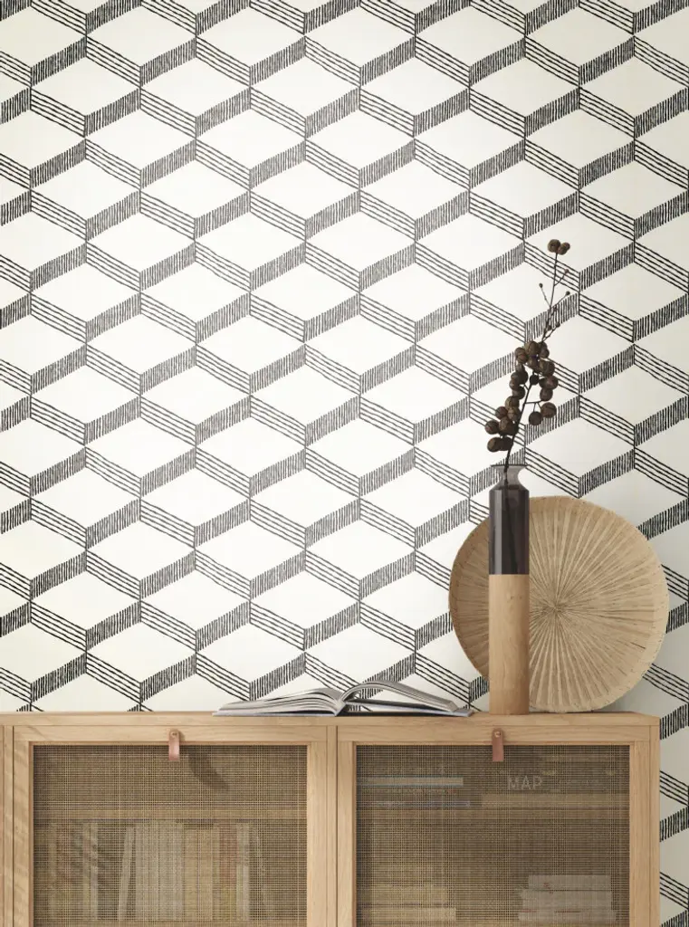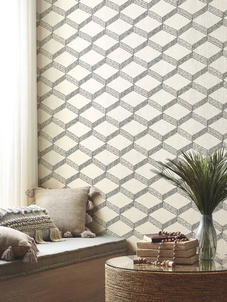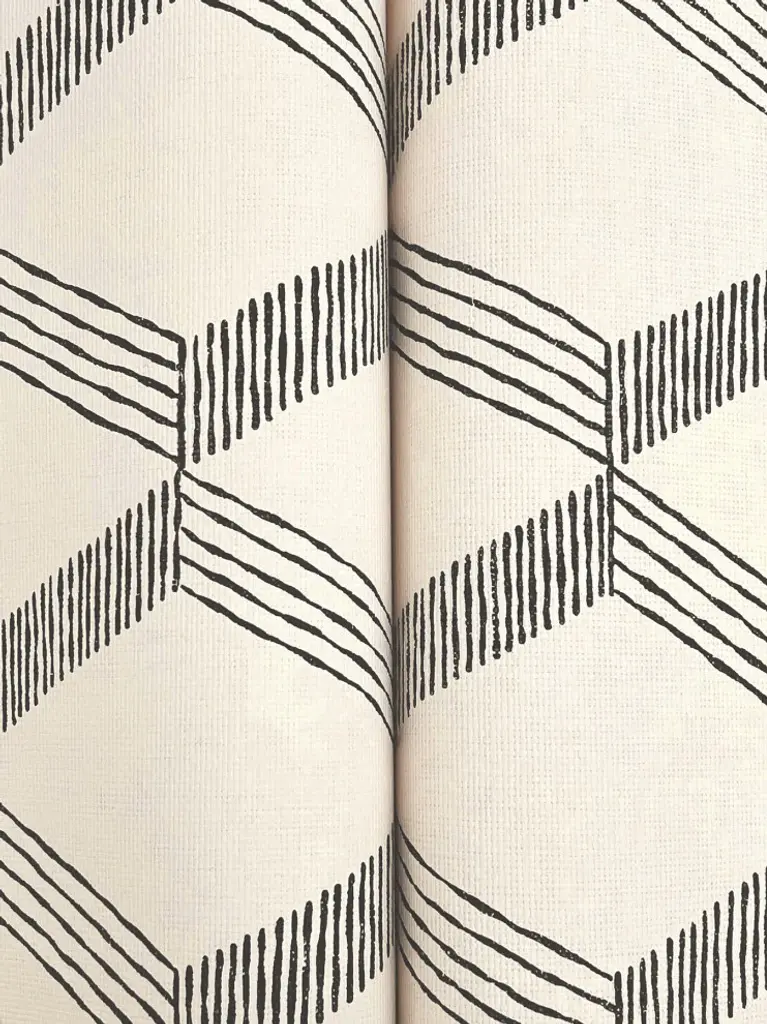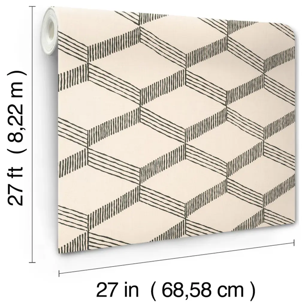 The horizontal and vertical lines which comprise the elongated diamond geometry of pattern Palisades Paperweave are printed on natural, woven paper. Featured here with black linework against a cream-hued grasscloth backing. This Palisades Paperweave Wallpaper measures approximately 27 inches wide by 27 feet long, measuring approximately 60.8 square feet per roll. The rich global heritage of timeless relics and hand-crafted naturals are artfully blended in this curated collection of culturally inspired designs. Unpasted paper weave grasscloth material. 25.25-in repeat, straight match. Dust and Vacuum and peelable. 27-in by 27-ft long roll. Covers about 60.8 square feet.