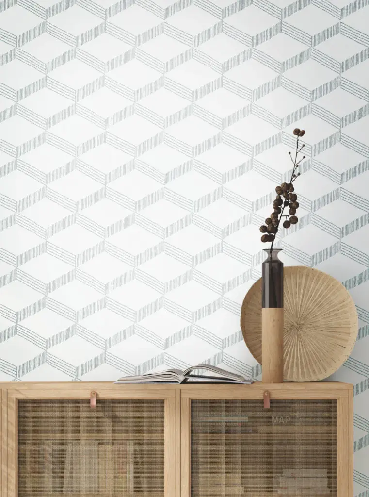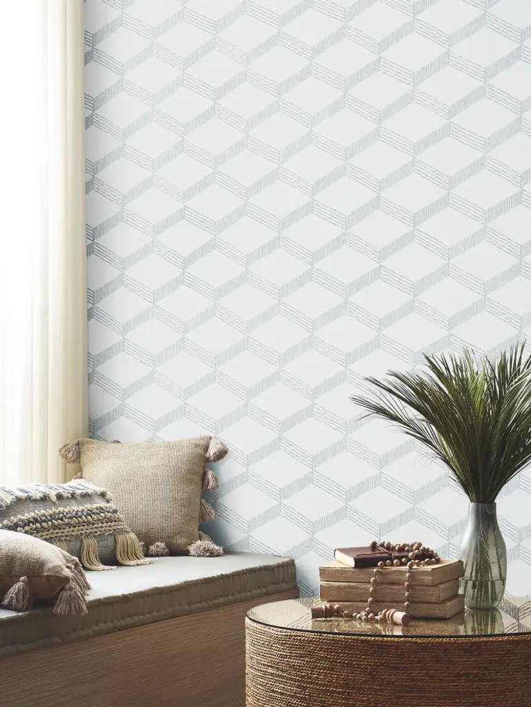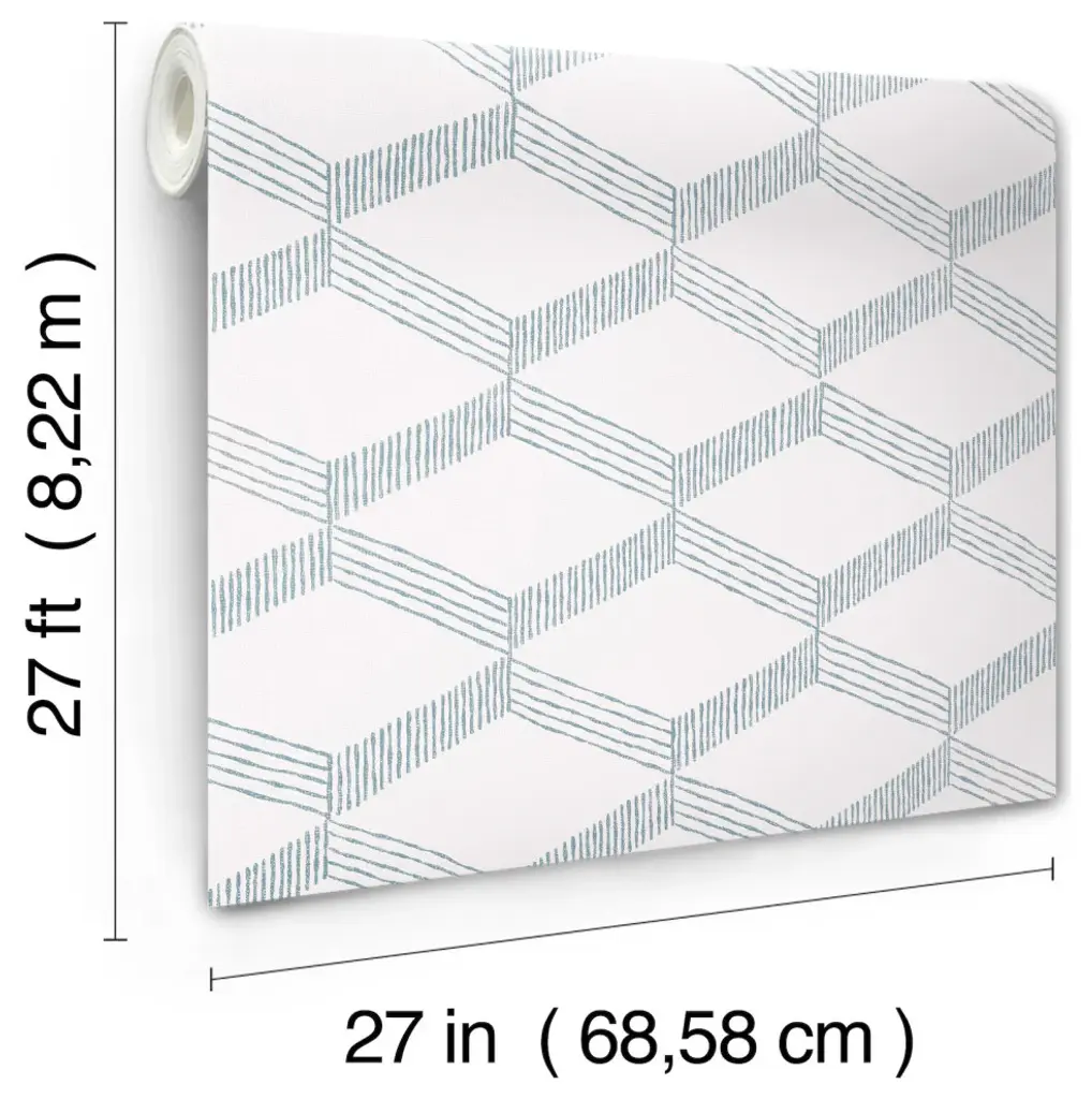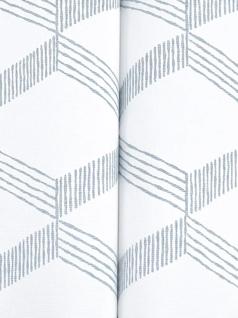 The horizontal and vertical lines which comprise the elongated diamond geometry of pattern Palisades Paperweave are printed on natural, woven paper. Featured here with smokey blue linework against an ivory-hued grasscloth backing. This Palisades Paperweave Wallpaper measures approximately 27 inches wide by 27 feet long, measuring approximately 60.8 square feet per roll. The rich global heritage of timeless relics and hand-crafted naturals are artfully blended in this curated collection of culturally inspired designs. Unpasted paper weave grasscloth material. 25.25-in repeat, straight match. Dust and Vacuum and peelable. 27-in by 27-ft long roll. Covers about 60.8 square feet.