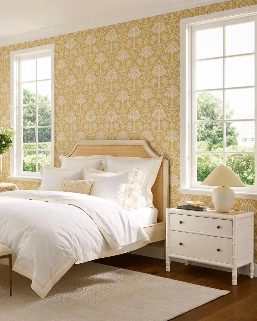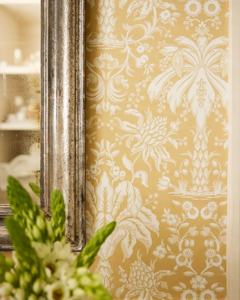 Tropical reverie. An expanse of iconic palmetto trees and lush foliage. A modern interpretation of a classic damask fabric.