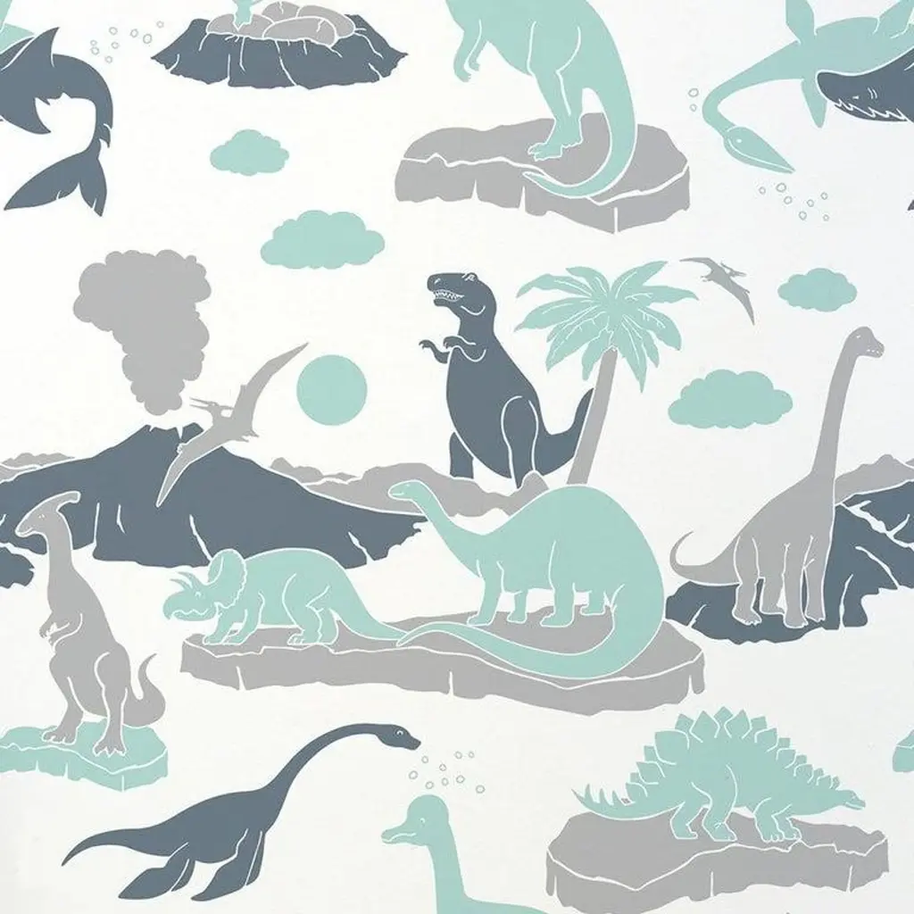 Pangaea Designer Dinosaur Wallpaper In Mineral 'Mint, Grey And Steel Blue'