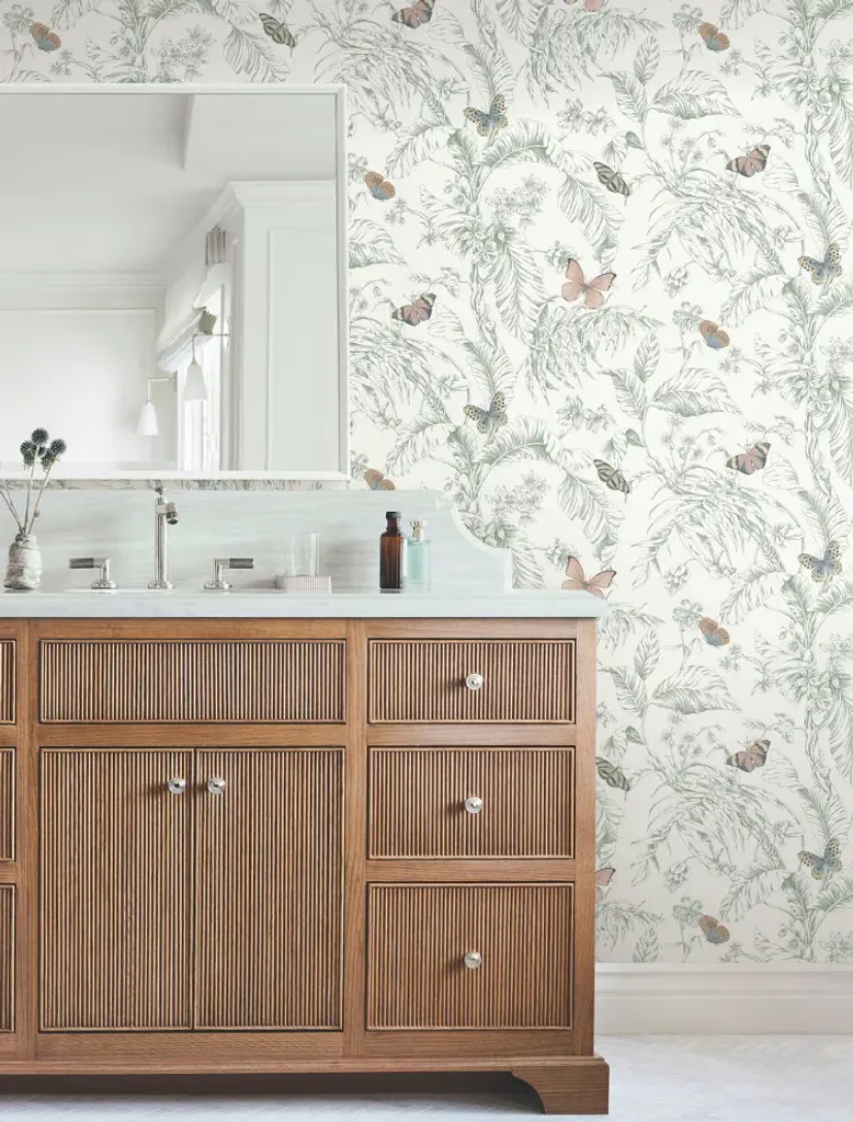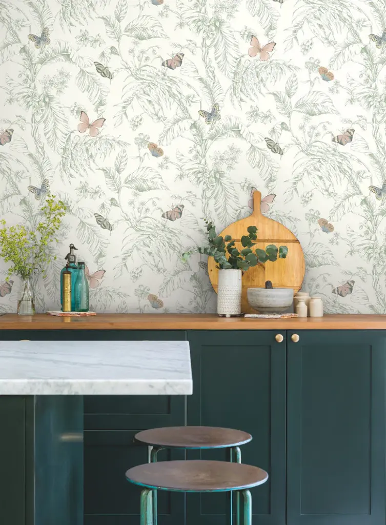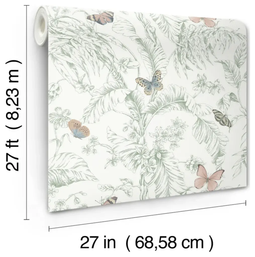 Vibrantly painted pink, cream, and blue butterflies pop against the delicate green linework of tropical flora in pattern Papillon. This Papillon Wallpaper measures approximately 27 inches wide by 27 feet long, measuring approximately 60.8 square feet per roll. The quintessential design for timeless romance, toile traces its origins to 18th century fabrics. This celebrated motif is explored with a range of classical reproductions and modern reimaginings. Prepasted sure strip material; 24-in repeat, drop match; Washable and strippable; 27-in by 27-ft long roll; Covers about 60.8 square feet