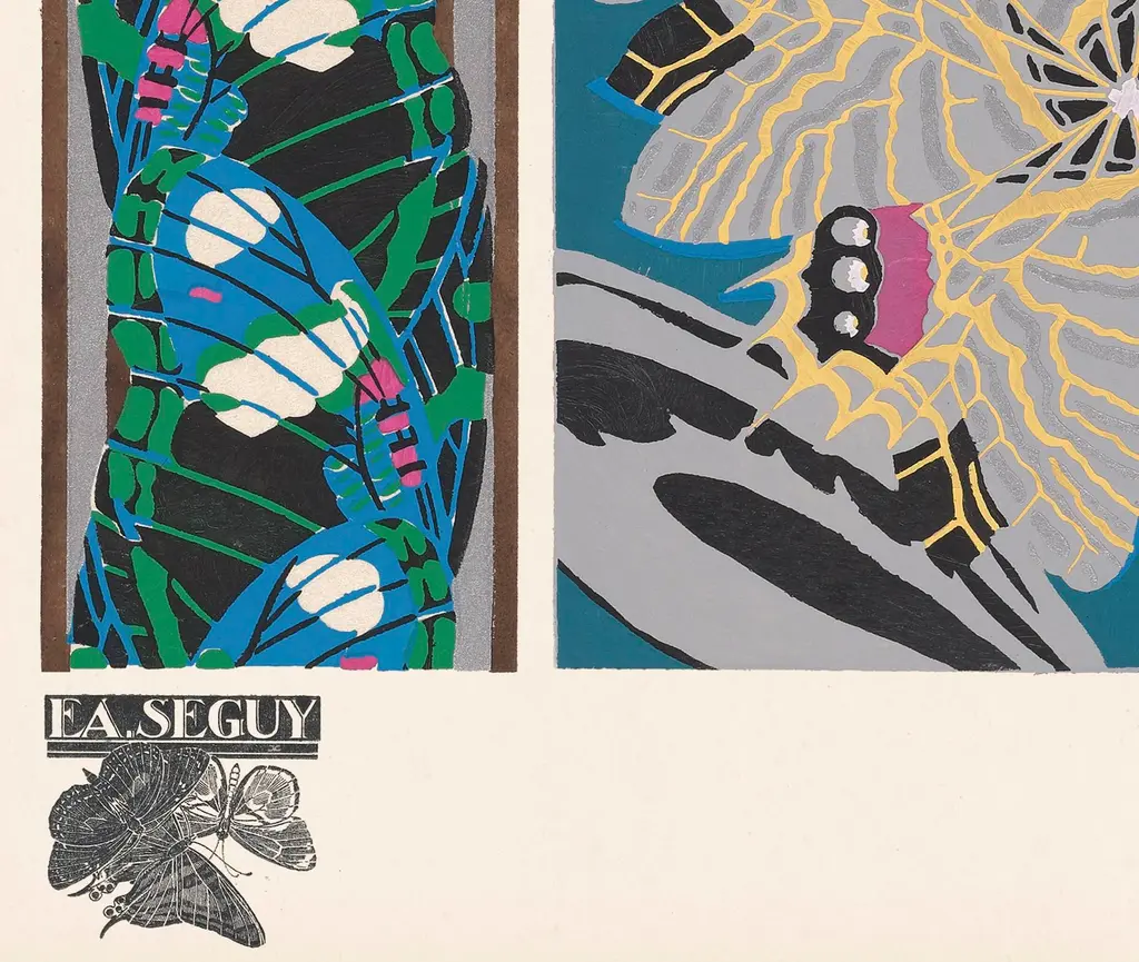 We are thrilled to present the exquisite Séguy Butterfly #17, available exclusively on Chairish, in the standard 14x18-inch size from CFA Editions. This offer features a beautifully crafted giclée reproduction, printed at ultra-high resolution on premium, acid-free, textured cotton rag paper imported from the renowned St. Cuthberts Mill in Wells, located in the southwest of England. With a legacy of papermaking dating back to the 1700s, St. Cuthberts Mill is celebrated for its exceptional craftsmanship. Printed using archival inks with a lightfastness rating of 200 years, this artwork guarantees vibrant, lasting colors, making it the finest reproduction available. Each print is designed to capture the essence of an original antique, complete with the character and charm of aged details. From the darkened edges that evoke years of handling and study to the subtle specks and imperfections of the original, this reproduction preserves the timeless beauty of its historic inspiration. The artist behind this masterpiece, Émile-Allain Séguy, was a French designer and artist celebrated for his groundbreaking contributions to the decorative arts and pattern design during the Art Deco period. Born on September 22, 1877, in Paris, France, and active until his passing in 1937, Séguy was a pioneer in blending natural motifs with geometric patterns and bold, vibrant colors. Séguy’s most iconic work, Papillons (Butterflies), is a stunning series of illustrations that meticulously depict butterfly species in symmetrical, visually captivating compositions. His extraordinary ability to capture the essence of nature in intricate patterns and rich palettes solidified his reputation as a master of Art Deco design. Over his prolific career, Séguy applied his talents to wallpapers, textiles, book covers, and decorative arts, often inspired by the flora and fauna that defined his unique artistic vision. Séguy’s legacy continues to influence artists and designers, with his work celebrated for its creativity, sophistication, and timeless appeal. Be sure to explore our other listings to discover the complete series of 20 stunning images from Papillons (Butterflies in French).