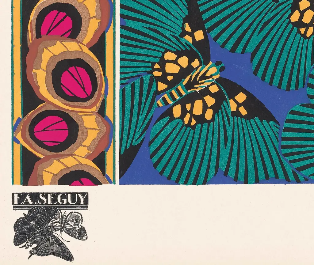 We are thrilled to present the exquisite Séguy Butterfly #18, available exclusively on Chairish, in the standard 14x18-inch size from CFA Editions. This offer features a beautifully crafted giclée reproduction, printed at ultra-high resolution on premium, acid-free, textured cotton rag paper imported from the renowned St. Cuthberts Mill in Wells, located in the southwest of England. With a legacy of papermaking dating back to the 1700s, St. Cuthberts Mill is celebrated for its exceptional craftsmanship. Printed using archival inks with a lightfastness rating of 200 years, this artwork guarantees vibrant, lasting colors, making it the finest reproduction available. Each print is designed to capture the essence of an original antique, complete with the character and charm of aged details. From the darkened edges that evoke years of handling and study to the subtle specks and imperfections of the original, this reproduction preserves the timeless beauty of its historic inspiration. The artist behind this masterpiece, Émile-Allain Séguy, was a French designer and artist celebrated for his groundbreaking contributions to the decorative arts and pattern design during the Art Deco period. Born on September 22, 1877, in Paris, France, and active until his passing in 1937, Séguy was a pioneer in blending natural motifs with geometric patterns and bold, vibrant colors. Séguy’s most iconic work, Papillons (Butterflies), is a stunning series of illustrations that meticulously depict butterfly species in symmetrical, visually captivating compositions. His extraordinary ability to capture the essence of nature in intricate patterns and rich palettes solidified his reputation as a master of Art Deco design. Over his prolific career, Séguy applied his talents to wallpapers, textiles, book covers, and decorative arts, often inspired by the flora and fauna that defined his unique artistic vision. Séguy’s legacy continues to influence artists and designers, with his work celebrated for its creativity, sophistication, and timeless appeal. Be sure to explore our other listings to discover the complete series of 20 stunning images from Papillons (Butterflies in French).