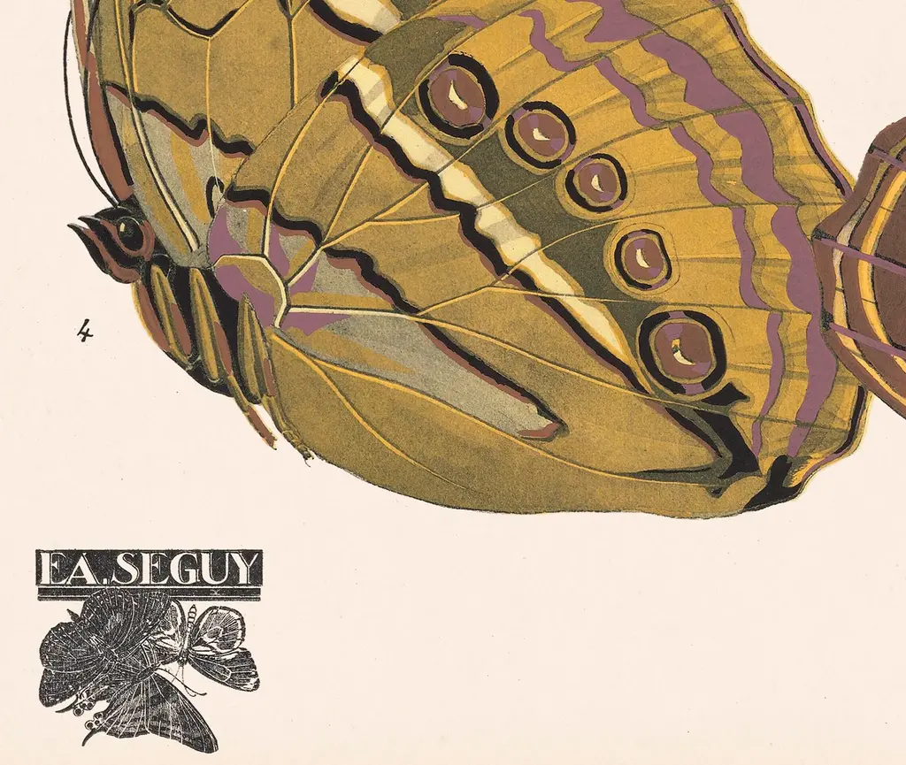 We are thrilled to present the exquisite Séguy Butterfly #04, available exclusively on Chairish, in the standard 14x18-inch size from CFA Editions. This offer features a beautifully crafted giclée reproduction, printed at ultra-high resolution on premium, acid-free, textured cotton rag paper imported from the renowned St. Cuthberts Mill in Wells, located in the southwest of England. With a legacy of papermaking dating back to the 1700s, St. Cuthberts Mill is celebrated for its exceptional craftsmanship. Printed using archival inks with a lightfastness rating of 200 years, this artwork guarantees vibrant, lasting colors, making it the finest reproduction available. Each print is designed to capture the essence of an original antique, complete with the character and charm of aged details. From the darkened edges that evoke years of handling and study to the subtle specks and imperfections of the original, this reproduction preserves the timeless beauty of its historic inspiration. The artist behind this masterpiece, Émile-Allain Séguy, was a French designer and artist celebrated for his groundbreaking contributions to the decorative arts and pattern design during the Art Deco period. Born on September 22, 1877, in Paris, France, and active until his passing in 1937, Séguy was a pioneer in blending natural motifs with geometric patterns and bold, vibrant colors. Séguy’s most iconic work, Papillons (Butterflies), is a stunning series of illustrations that meticulously depict butterfly species in symmetrical, visually captivating compositions. His extraordinary ability to capture the essence of nature in intricate patterns and rich palettes solidified his reputation as a master of Art Deco design. Over his prolific career, Séguy applied his talents to wallpapers, textiles, book covers, and decorative arts, often inspired by the flora and fauna that defined his unique artistic vision. Séguy’s legacy continues to influence artists and designers, with his work celebrated for its creativity, sophistication, and timeless appeal. Be sure to explore our other listings to discover the complete series of 20 stunning images from Papillons (Butterflies in French).
