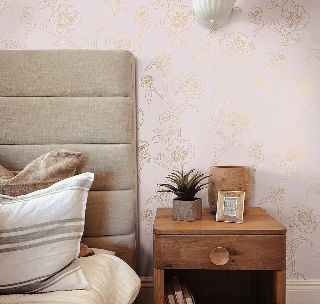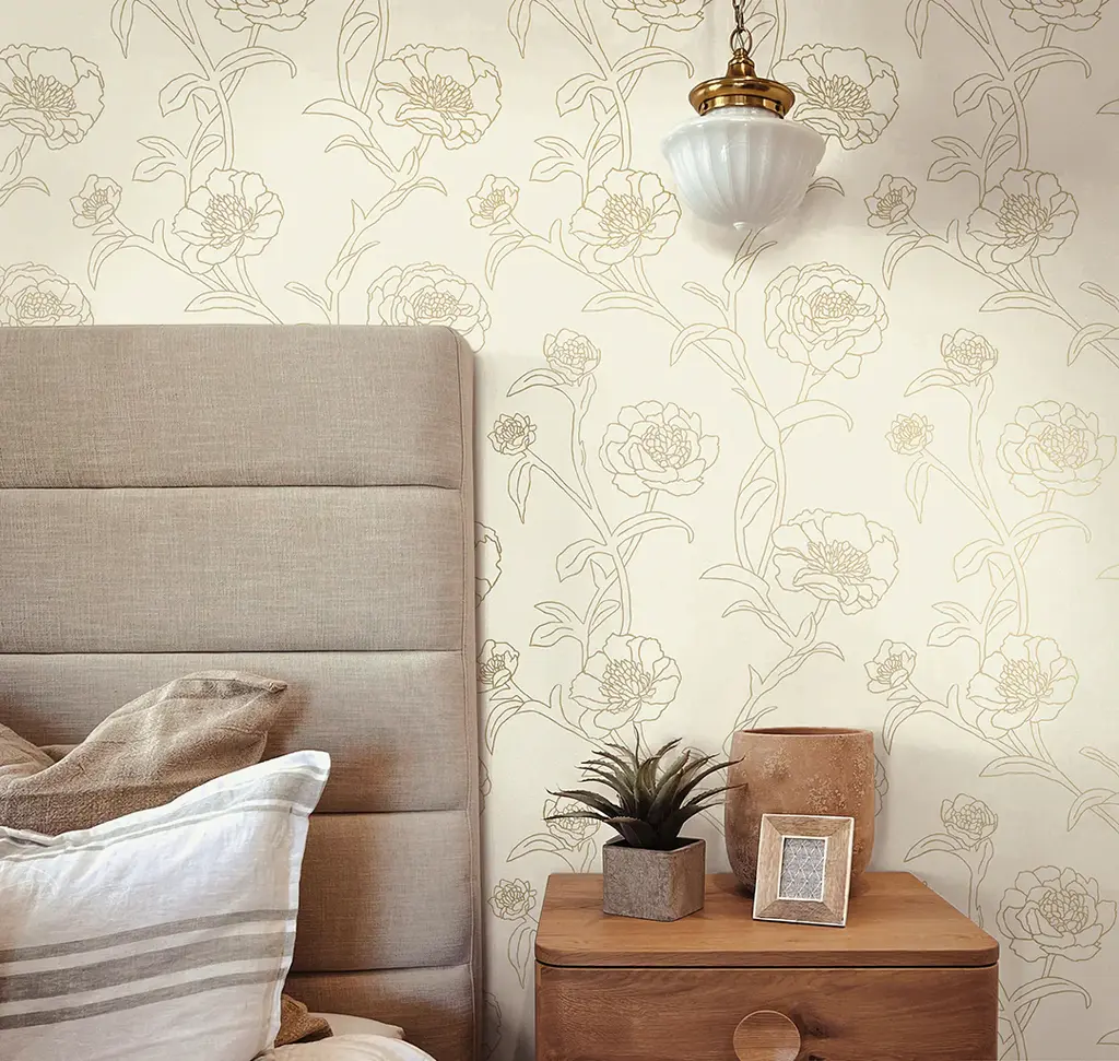 Discover the perennial charm of Tempaper's Peonies design, a stunning hand-drawn floral peel and stick wallpaper featuring flowing peonies in a metallic gold outline. This best-selling flower wallpaper brings an elegant look that enhances both youthful and sophisticated spaces, making it a versatile choice for classic, contemporary, and heritage-style decor. Enjoy the timeless beauty of this distinguished floral wallpaper for as long as you wish; when it’s time for a fresh look, simply peel off and remove with ease. Tempaper & Co., the pioneers of peel and stick wallpaper, offers décor enthusiasts the freedom to be wonderfully creative when decorating. DIY-friendly product allows you to embrace pattern, texture, and color, and to create bold and expressive interiors that can be as temporary or as permanent as you like. Installation is a breeze, and it removes cleanly without harming walls. Breakthrough, proprietary product uses clean materials and meets strict standards. Apply peel and stick wallpaper to walls, stair risers, furniture, ceilings, bathrooms and more. The product works best when applied to surfaces that have been primed and painted with an eggshell, satin, or semi-gloss finish. Applications on flat and matte paints and textured surfaces are not recommended. Features Samples: Due to variances in color perception with a monitor, samples are available and strongly recommended.