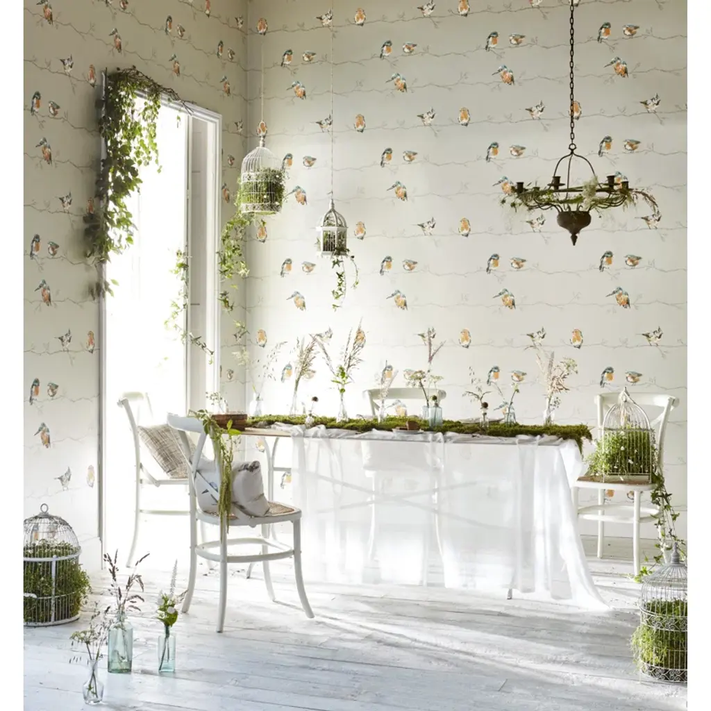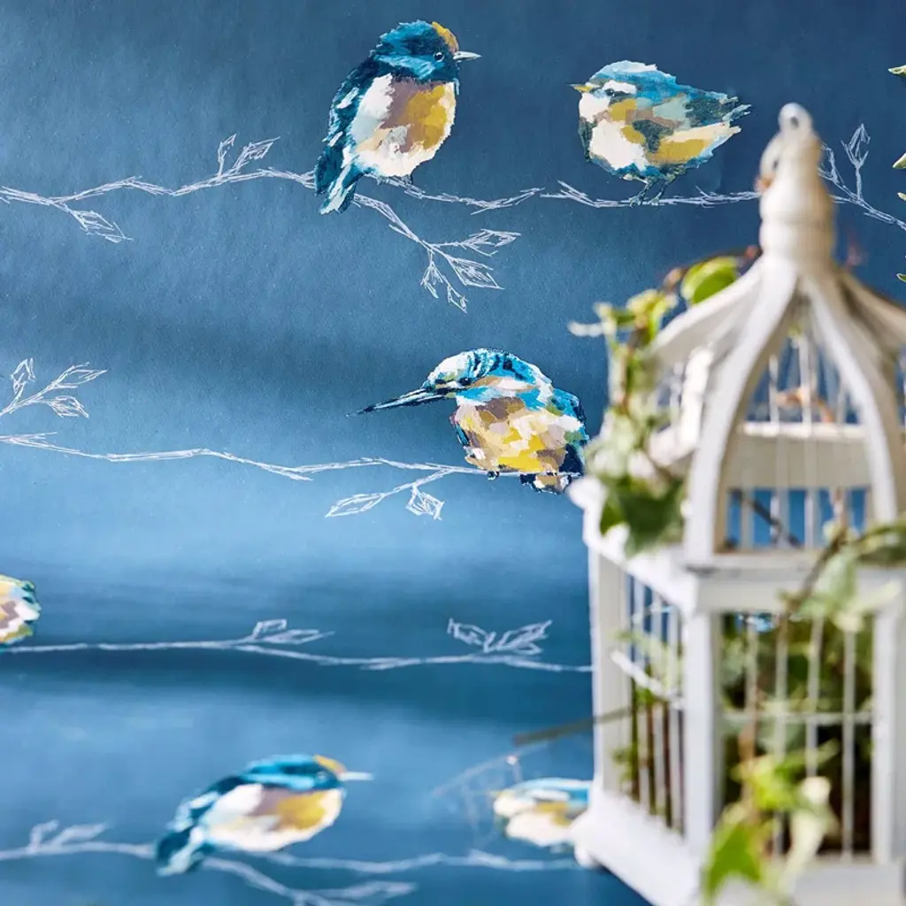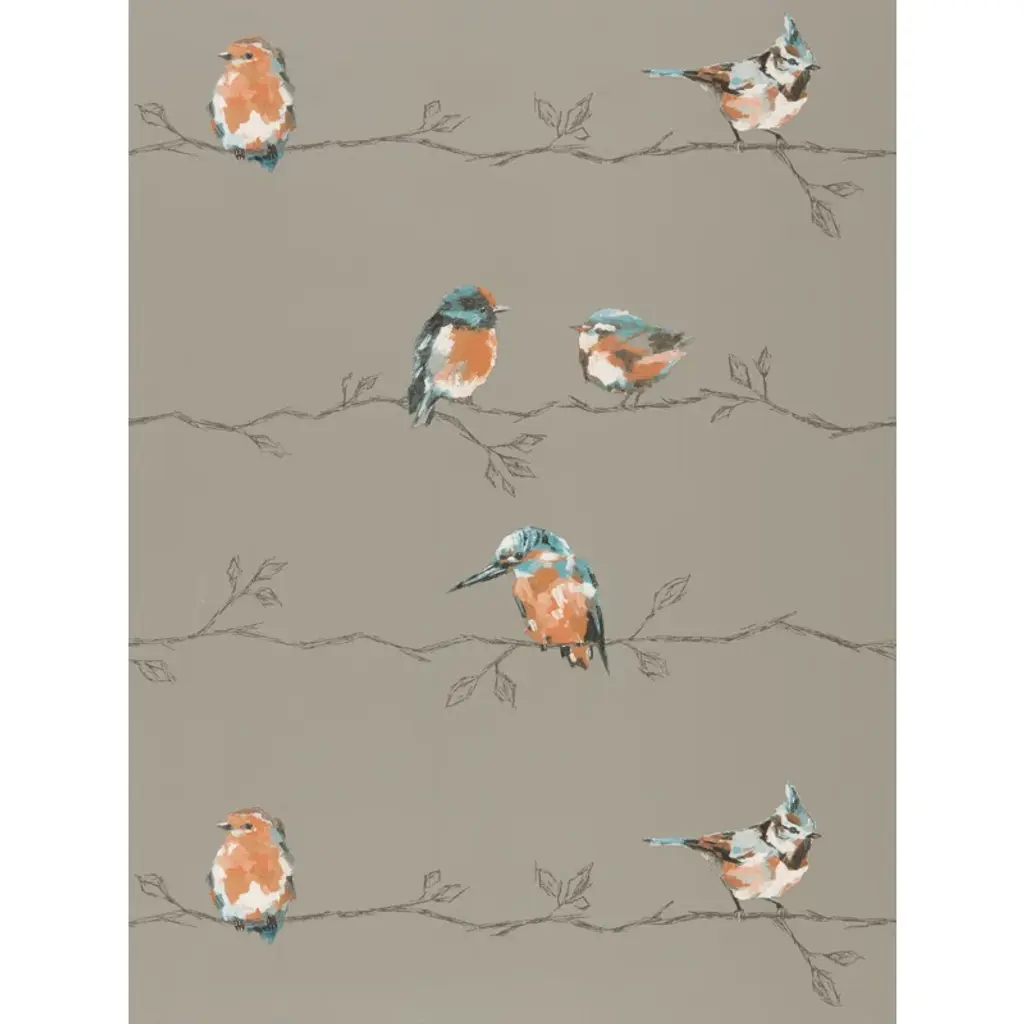 Standing Ovation - Persico. Enchanting British birds in all their beauty perch at random intervals on this wallpaper design, gravure printed on a wide-width paper.
