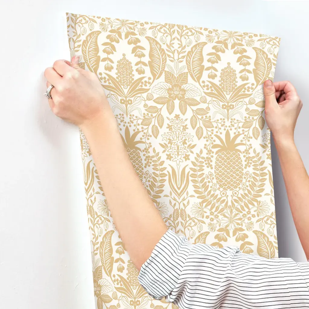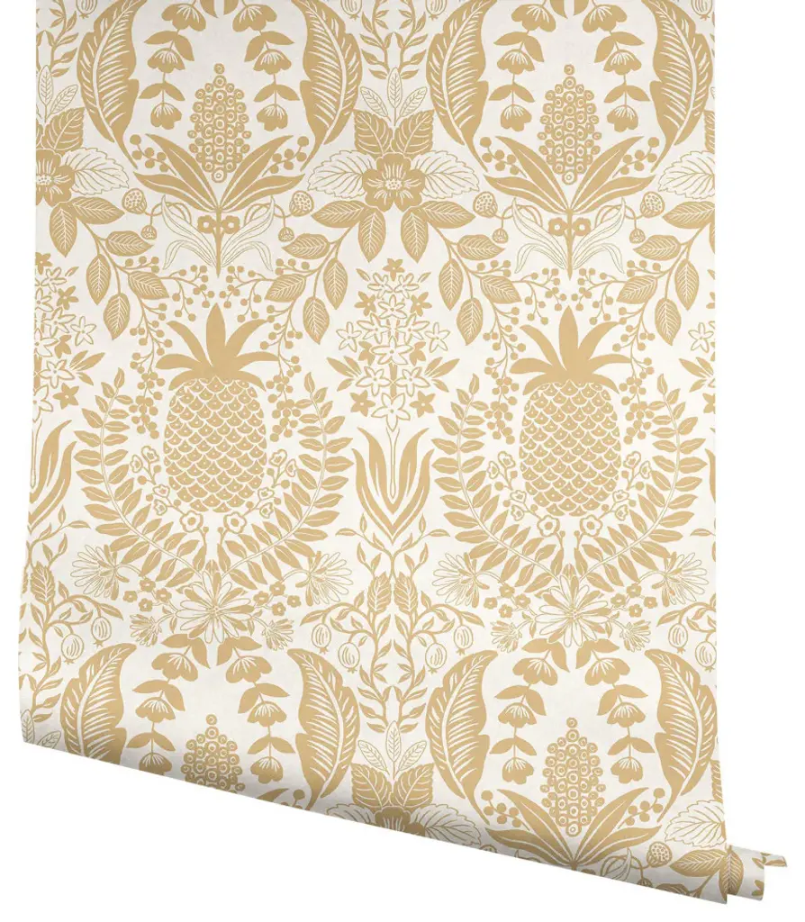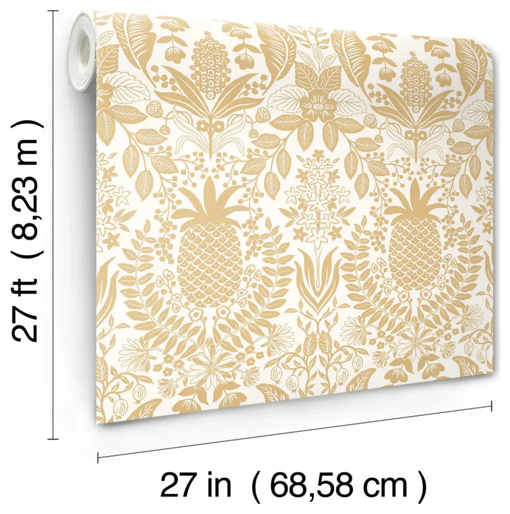 Pineapple Damask celebrates traditional symbols of hospitality with pineapples framed by rich floral accents, the pattern inked in tangerine along a white backdrop. This Pineapple Damask Wallpaper measures approximately 27 inches wide by 27 feet long, measuring approximately 60.8 square feet per roll. The world of Rifle Paper Co. is in full bloom with their third wallpaper collection. With statement floral prints, detailed illustrated designs, and metallic accents, this collection is designed to bring beauty to every room. Unpasted non woven material; 25.25-in repeat, straight match; Washable and strippable; 27-in by 27-ft long roll; Covers about 60.8 square feet