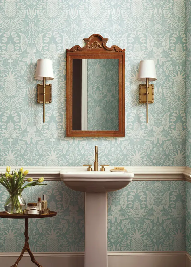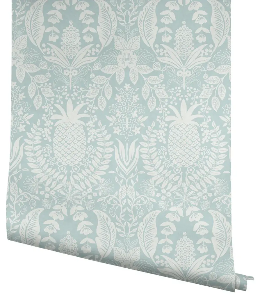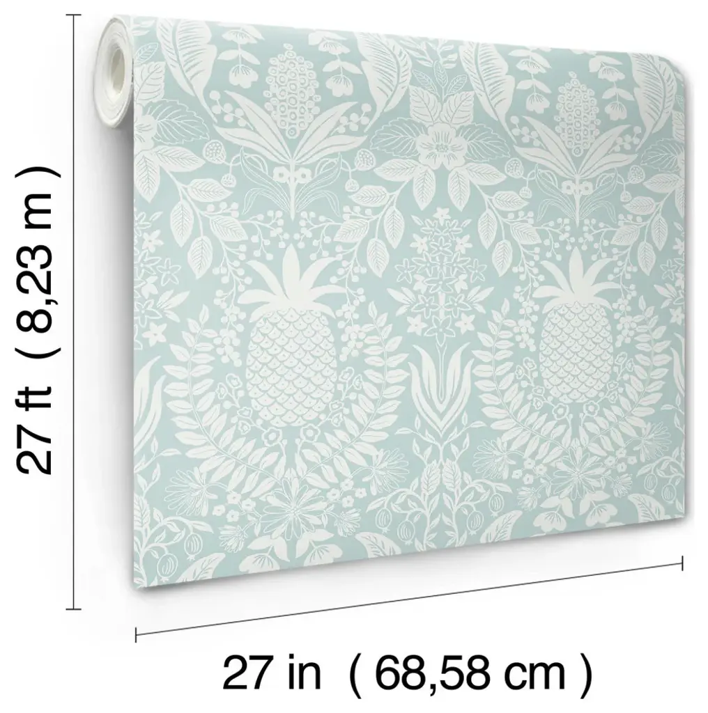 Pineapple Damask celebrates traditional symbols of hospitality with pineapples framed by rich floral accents, the pattern inked in white along a sky blue backdrop. This Pineapple Damask Wallpaper measures approximately 27 inches wide by 27 feet long, measuring approximately 60.8 square feet per roll. The world of Rifle Paper Co. is in full bloom with their third wallpaper collection. With statement floral prints, detailed illustrated designs, and metallic accents, this collection is designed to bring beauty to every room. Unpasted non woven material; 25.25-in repeat, straight match; Washable and strippable; 27-in by 27-ft long roll; Covers about 60.8 square feet