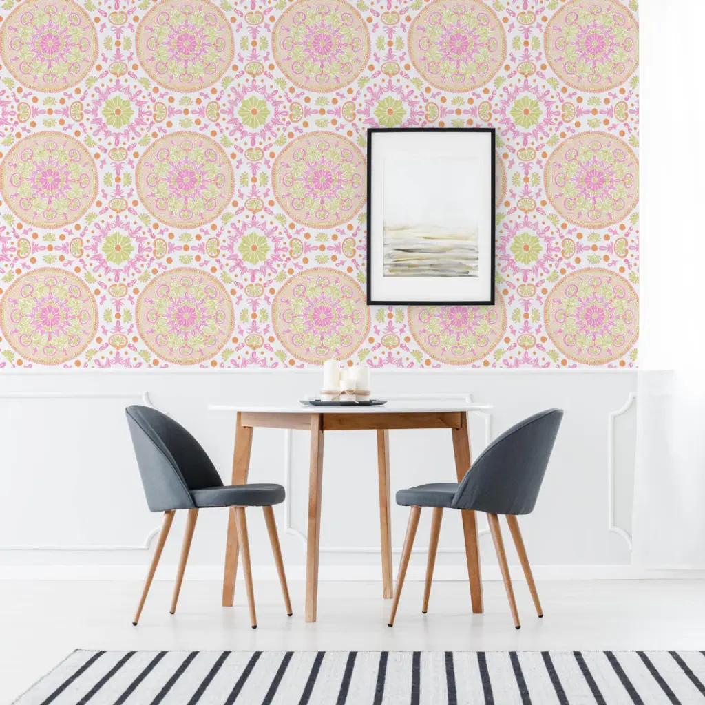 Each roll of wallpaper is custom printed to order and has a fixed width that covers 24 inches of wall space. Peel & Stick Fabric Wallpaper - Removable and Repositionable! Limitless Walls Fabric Peel and Stick wallpaper is a woven polyester fabric with an adhesive backing. Limitless Walls fabric is not like everyone else"™s, ours is the thickest most durable and easiest to install. You won"™t be able to find this anywhere else since we make it ourselves!• 100% opaque white polyester woven with adhesive backing• Eco-friendly and formaldehyde-, phthalate-, and PVC-free• To install, simply peel and stick• Easily removable and repositionable IMPORTANT NOTE Our wallpapers are not recommended for application over paints advertised as being stain-resistant or washable. These paints are crafted to prevent things from sticking -- including wallpaper. If in doubt, you can use Zinsser Gardz which is a clear primer that you can apply right over your current paint. If your wall has been recently painted, allow at least 2+ weeks for the paint to cure before applying wallpaper. Applying wallpaper over uncured paint can lead to bubbling. Our wallpaper will not stick to cement or textured walls.We highly recommend ordering a test swatch before committing to full rolls. While we have done our best to accurately represent the color and scale of this design, computer monitors aren''t the best way to determine how a printed color will look in person. It''s possible that the finished product may be slightly different than it appears in the preview. It is also important to test the adhesive on your unique surface.CARE INSTRUCTIONS:Gently wipe down with a damp cloth, soft cleaners such as dish soap can be used. The use of heavy cleaners or heavy rubbing can cause color to lift.Original Design by Julia Schumacher.
