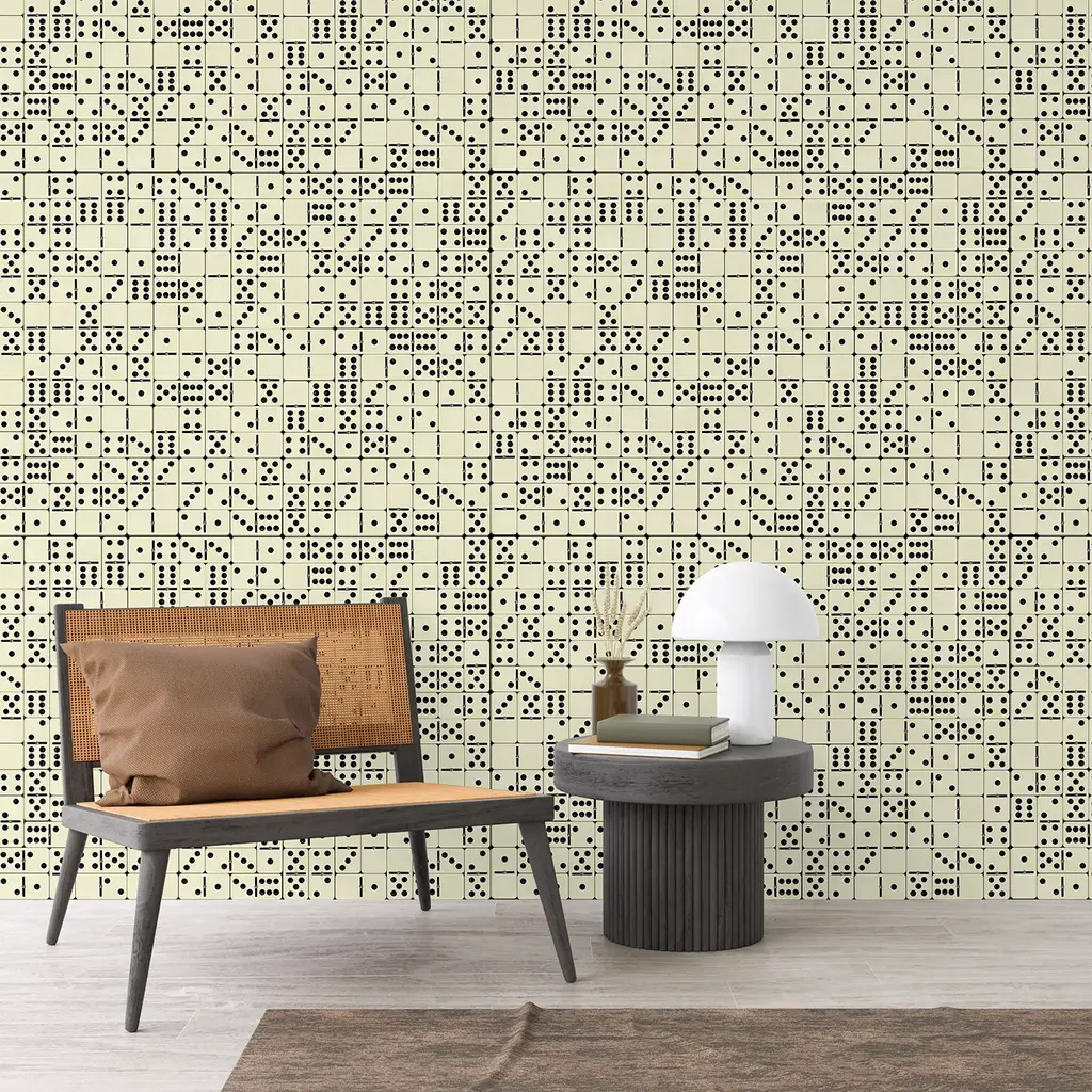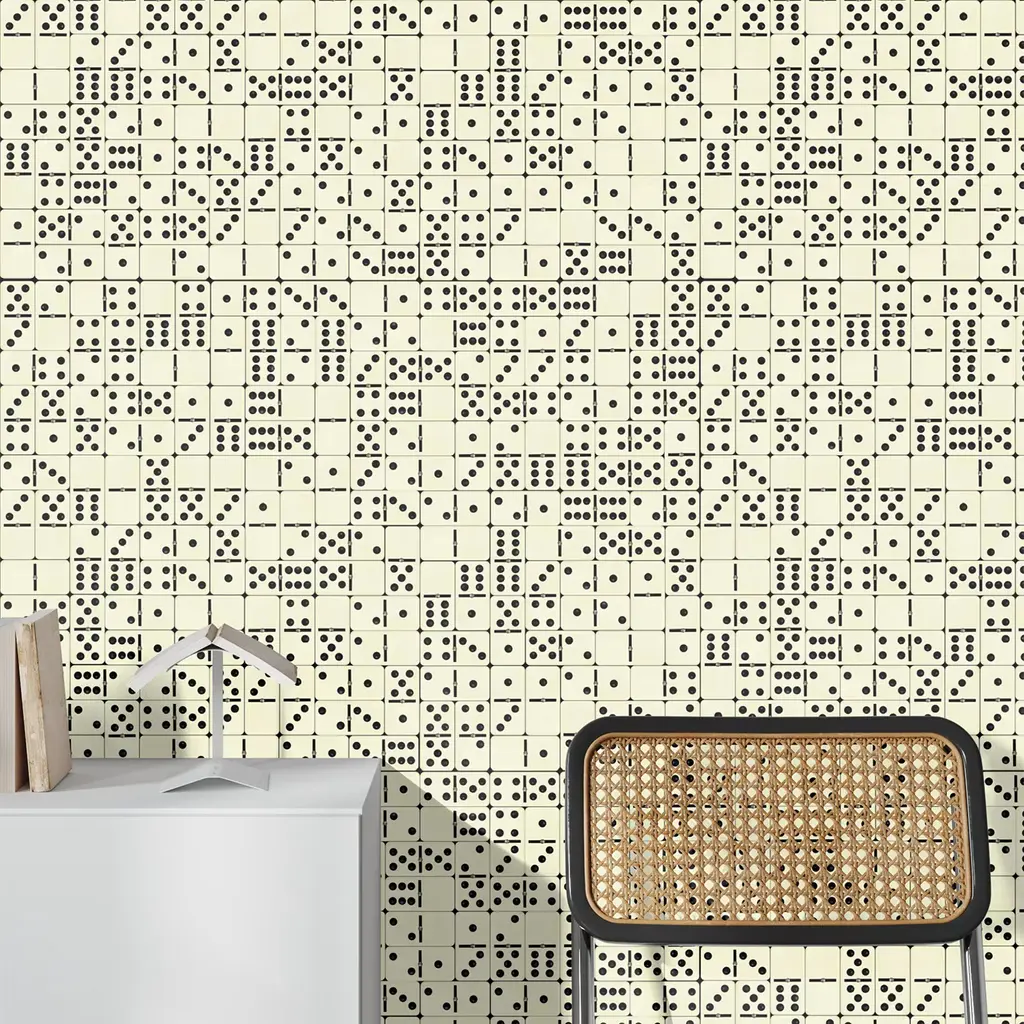 Ecological wallpaper, crafted from vegan water-based inks, designed and printed in Italy using the most advanced technologies. Versatile for walls, shelves, and furniture, it elevates any space. Featuring closely arranged domino tiles, its unique design captivates with a modern monochromatic twist bringing retro-inspired charm and creating a vibrant and playful environment. Instructions are included. Each sheet measures 27.5x39.4 inches/70x100 cm, covering a total area of 5 MQ.