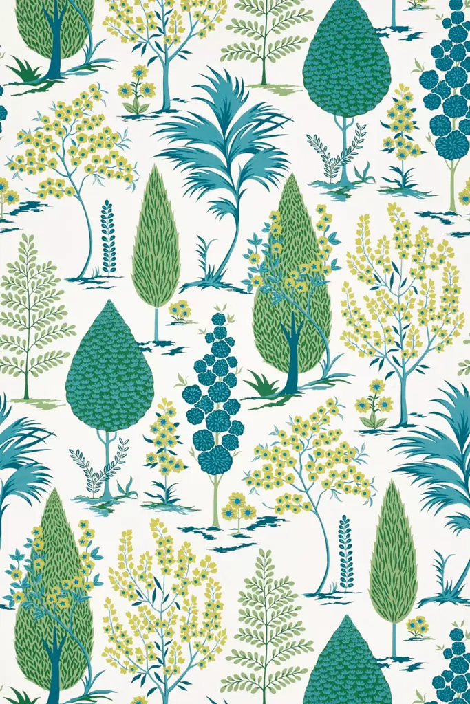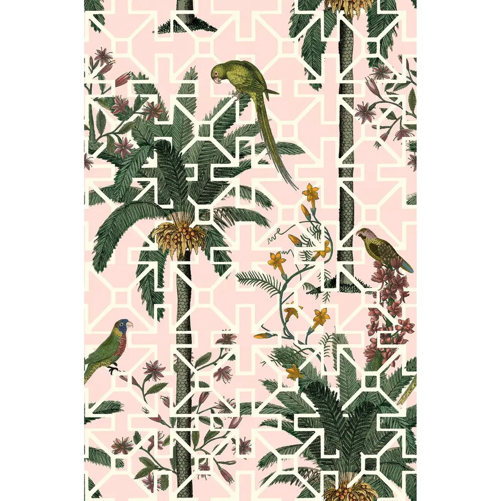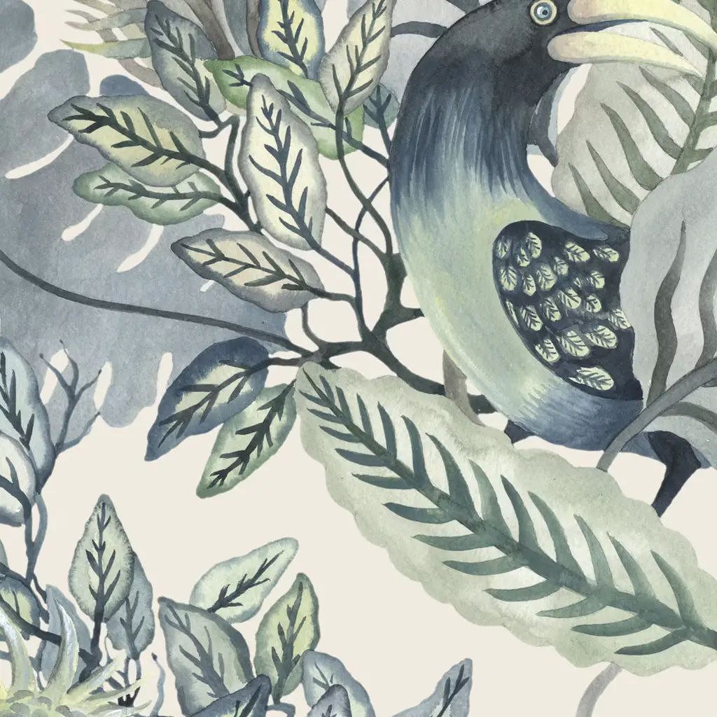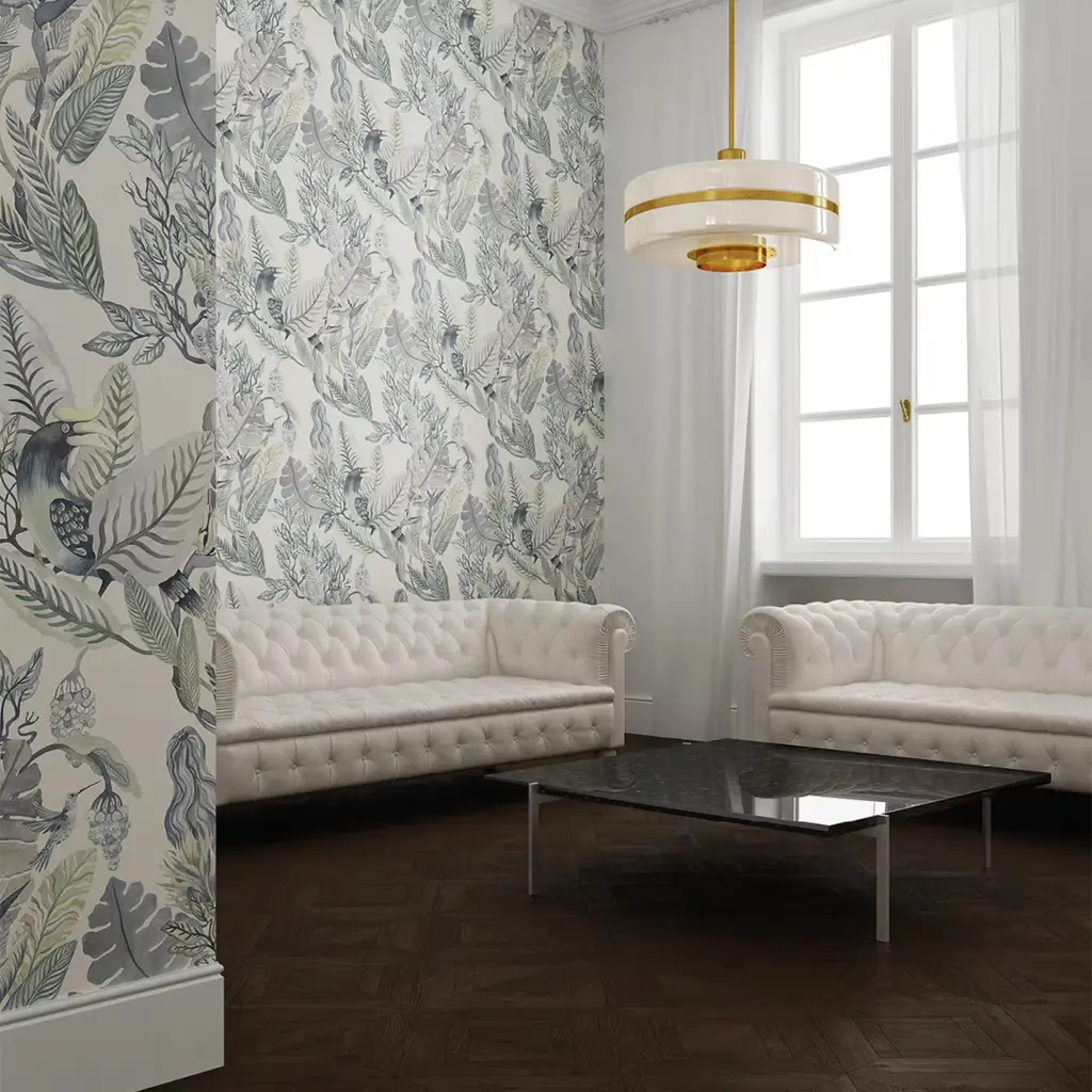 Pricing is per square meter. Tropical birds in a fanciful forest of philodendron and strelitzia plants are represented in wallpaper by Francesca Greco with extra-large motifs that have a highly decorative effect. Available in four colors. Please contact the concierge service for further information.