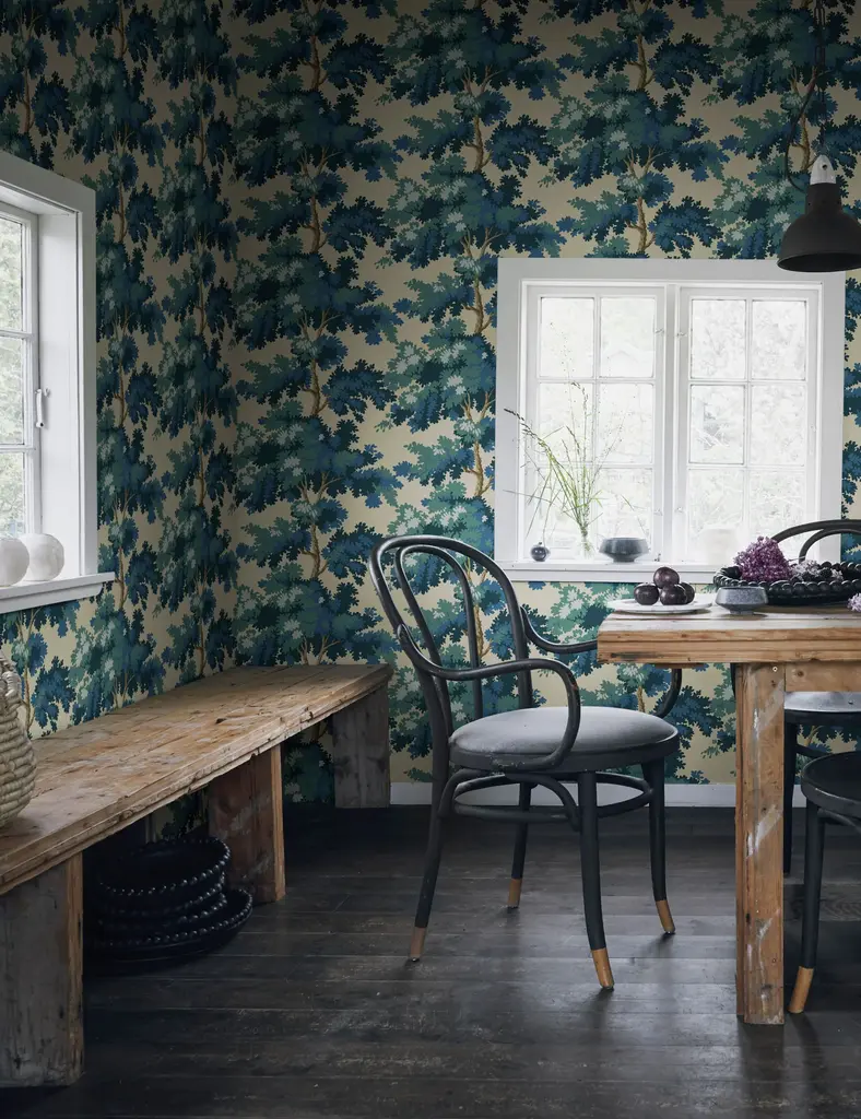 Inspired by the leafy urban landscape of Central Park and informed by the signature shading of antique tapestries, this modern floral wallpaper design will add a dynamic layer of botanical texture to a bedroom, nursery, or living space.