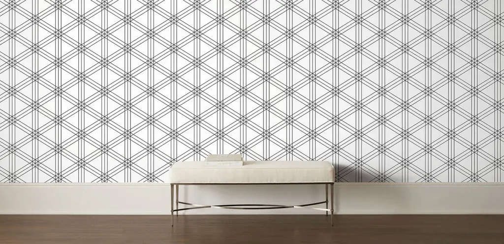 A latticework of intersecting lines on a neutral background makes for a modern accent wall. The large-scale diamonds in our Ray wallpaper are tidy and elegant; we love them in formal spaces like dining rooms and sitting rooms.