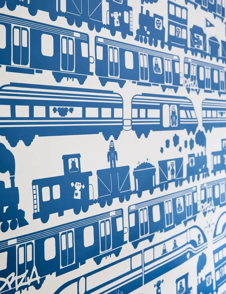 This adorable children's pattern by Aimée was inspired by trains from around the world, and incorporate her beloved robot characters! Samples are available for $18 including US shipping, please message us to purchase.Printing: Digital pigment print (minimum order of 4 rolls), or screen-printed by hand (minimum order and setup fees apply).Material: FSC-certified paper.Trimming: This product may come pre-trimmed or untrimmed.Packaging: May be shipped as double rolls, or as a combination of double and single rolls.Single roll: 27 inches× 5 yards (68.8 cm× 4.5 meters)Sheet: 27× 36 inches (68.8× 91.4 cm)Sample:~ 8× 10 inches (20.3× 25.4 cm)Design Repeat: 27 inches (68.6 cm).Design Match: StraightSize note: Subway car measures 12.25 inches (31.1 cm) wide.Made in the USA. Ships worldwide.Commercial grade options available; please contact us for more information.Image 2 and 4: Photography by Dylan Chandler.