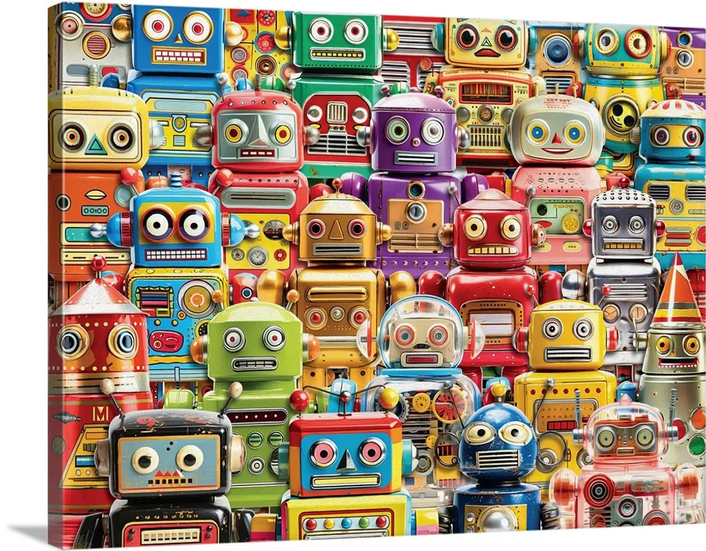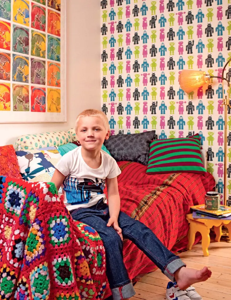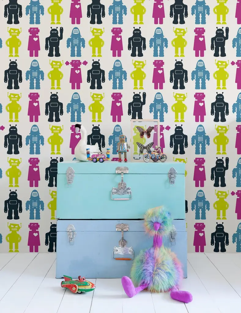 Robots Designer Wallpaper In Classic 'Lime, Magenta, Blue And Charcoal'