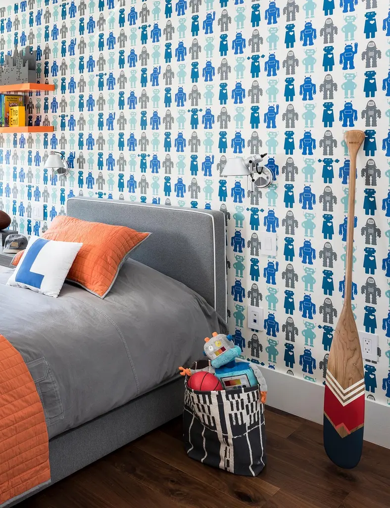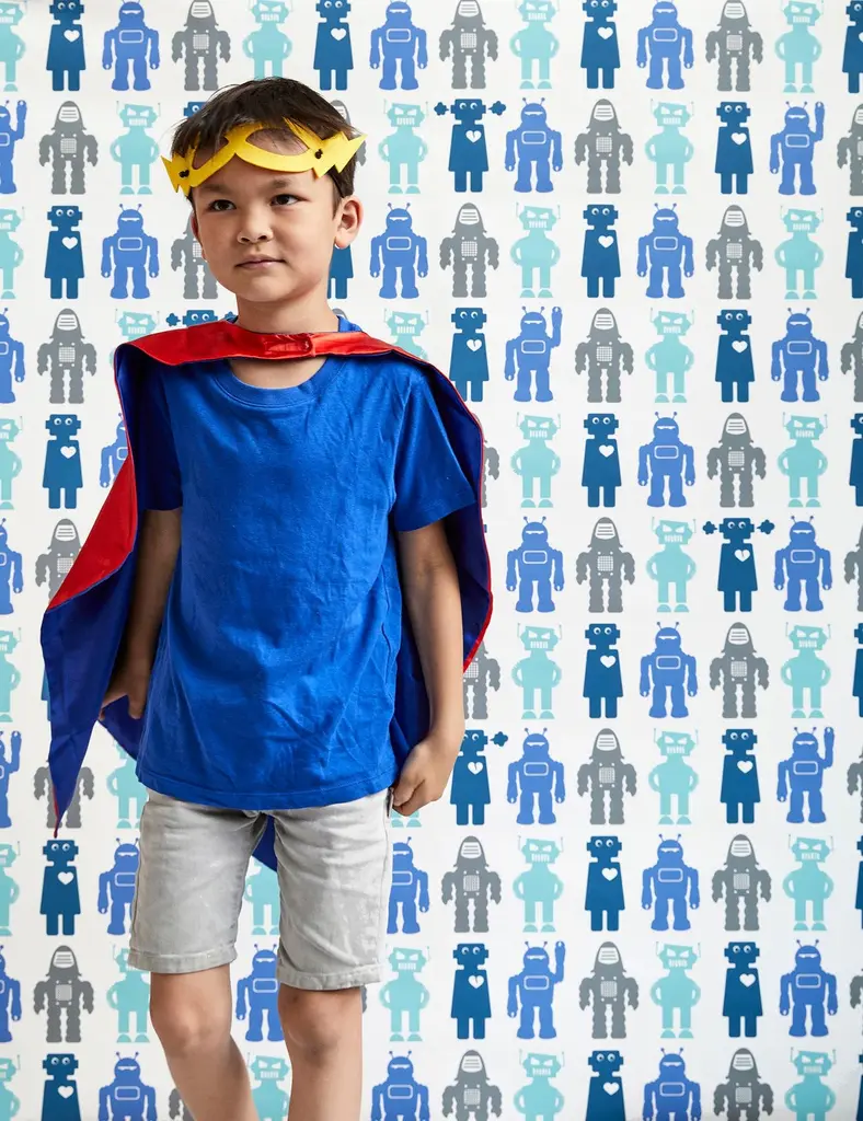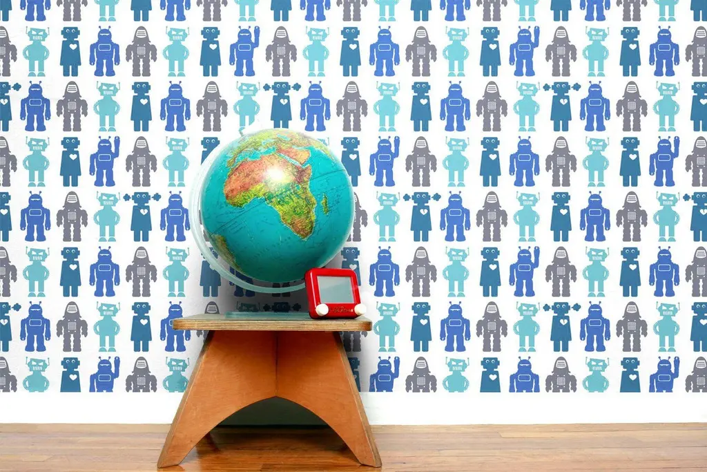 This hand-printed wall-covering with Aimée's signature Robots is he perfect wallpaper for your child's nursery, bedroom or playroom!Samples are available for $18 including US shipping, please message us to purchase.Printing: Digital pigment print (minimum order of 4 rolls).Material: FSC-certified paper. Trimming: This product may come pre-trimmed or untrimmed. Packaging: May be shipped as double rolls, or as a combination of double and single rolls. Single roll: 27 inches × 5 yards (68.8 cm × 4.5 meters) Sheet: 27 × 36 inches (68.8 × 91.4 cm)Sample:~ 8 × 10 inches (20.3 × 25.4 cm)Design Repeat: 32 inches (81.3 cm)Design Match: Straight Size note: 1 robot measures 4.75 inches (12 cm) tall.Made in the USA. Ships worldwide.Commercial grade options available; please contact us for more information.Image 2: Photography by Dylan Chandler.