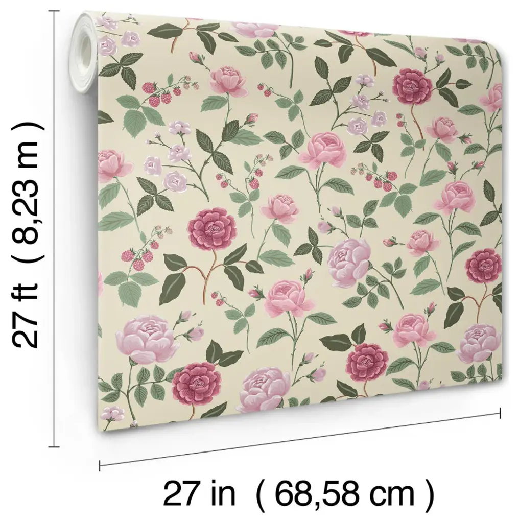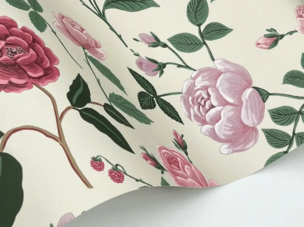 The layered details of Roses are inspired by vintage botanical drawings, the blooms and playful raspberry clippings inked in shades of lavender, blush, merlot, sage, and moss against a cream backdrop. This Roses Wallpaper measures approximately 27 inches wide by 27 feet long, measuring approximately 60.8 square feet per roll. The world of Rifle Paper Co. is in full bloom with their third wallpaper collection. With statement floral prints, detailed illustrated designs, and metallic accents, this collection is designed to bring beauty to every room. Unpasted non woven material; 24-in repeat, drop match; Washable and strippable; 27-in by 27-ft long roll; Covers about 60.8 square feet