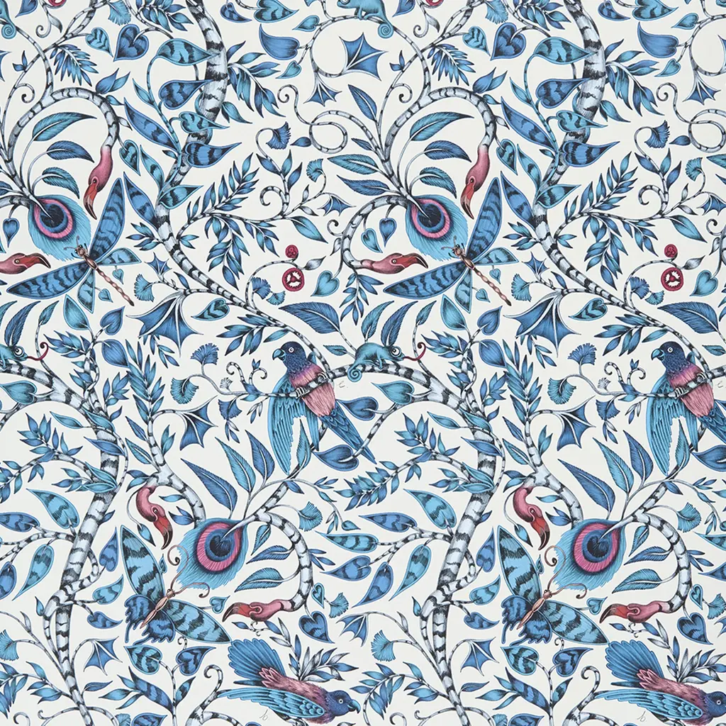 Made in partnership with interior design experts Clarke & Clarke, the Rousseau Wallpaper features an intricately hand-drawn pattern of winding jungle foliage, peacock features, and curious birds + creatures in a variety of bold color options with metallic highlights. This magical traditional wallpaper is part of the magical Animalia Collection by British graphic designer Emma J Shipley, specializing in home wallpaper for nature lovers, dreamers, and maximalists that are sure to be treasured for years to come. Reemerging as a top trend in home decor, wallpaper allows you to create a unique aesthetic with a bold backdrop or an eye-catching accent wall.
