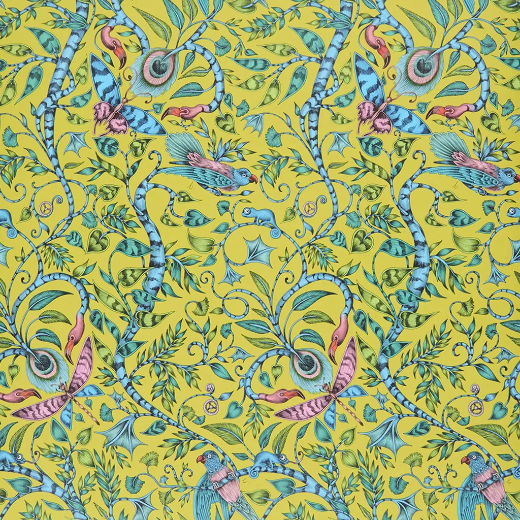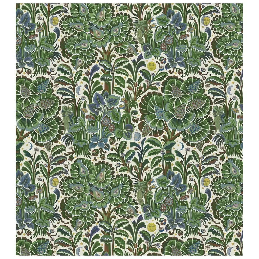 Made in partnership with interior design experts Clarke & Clarke, the Rousseau Wallpaper features an intricately hand-drawn pattern of winding jungle foliage, peacock features, and curious birds + creatures in a variety of bold color options with metallic highlights. This magical traditional wallpaper is part of the magical Animalia Collection by British graphic designer Emma J Shipley, specializing in home wallpaper for nature lovers, dreamers, and maximalists that are sure to be treasured for years to come. Reemerging as a top trend in home decor, wallpaper allows you to create a unique aesthetic with a bold backdrop or an eye-catching accent wall.