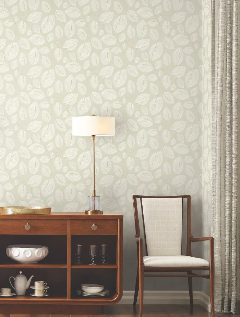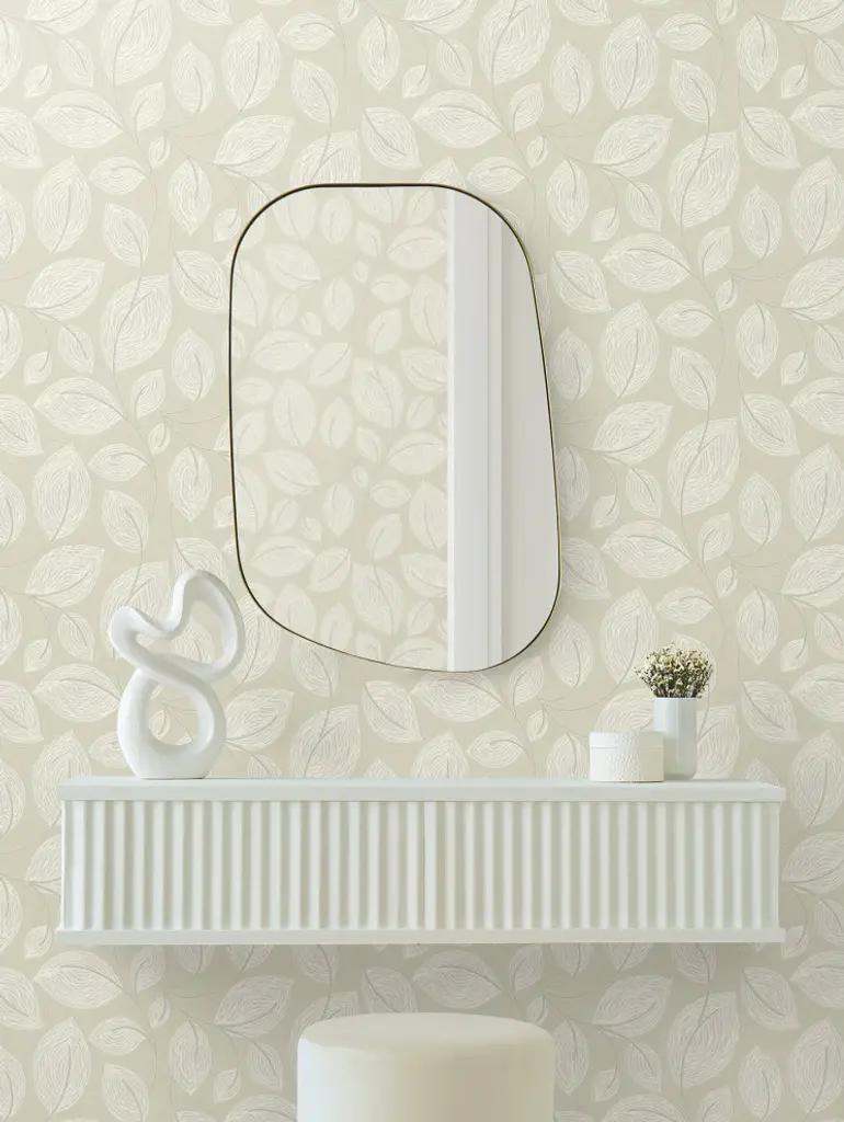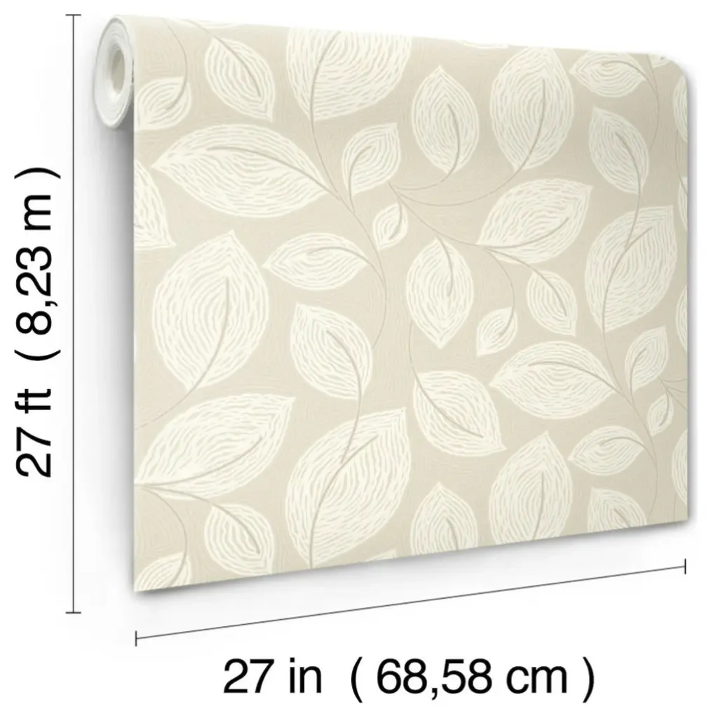Sprigs of Contoured Leaves featuring white veining float across a pale beige canvas with topographic, pearlescent detailing for added depth. This Contoured Leaves Wallpaper measures approximately 27 inches wide by 27 feet long, measuring approximately 60.8 square feet per roll. Organic simplicity and lustrous adornment for the modern home. Unpasted non woven material25.25-in repeat, straight matchWashable and strippable27-in by 27-ft long rollCovers about 60.8 square feet