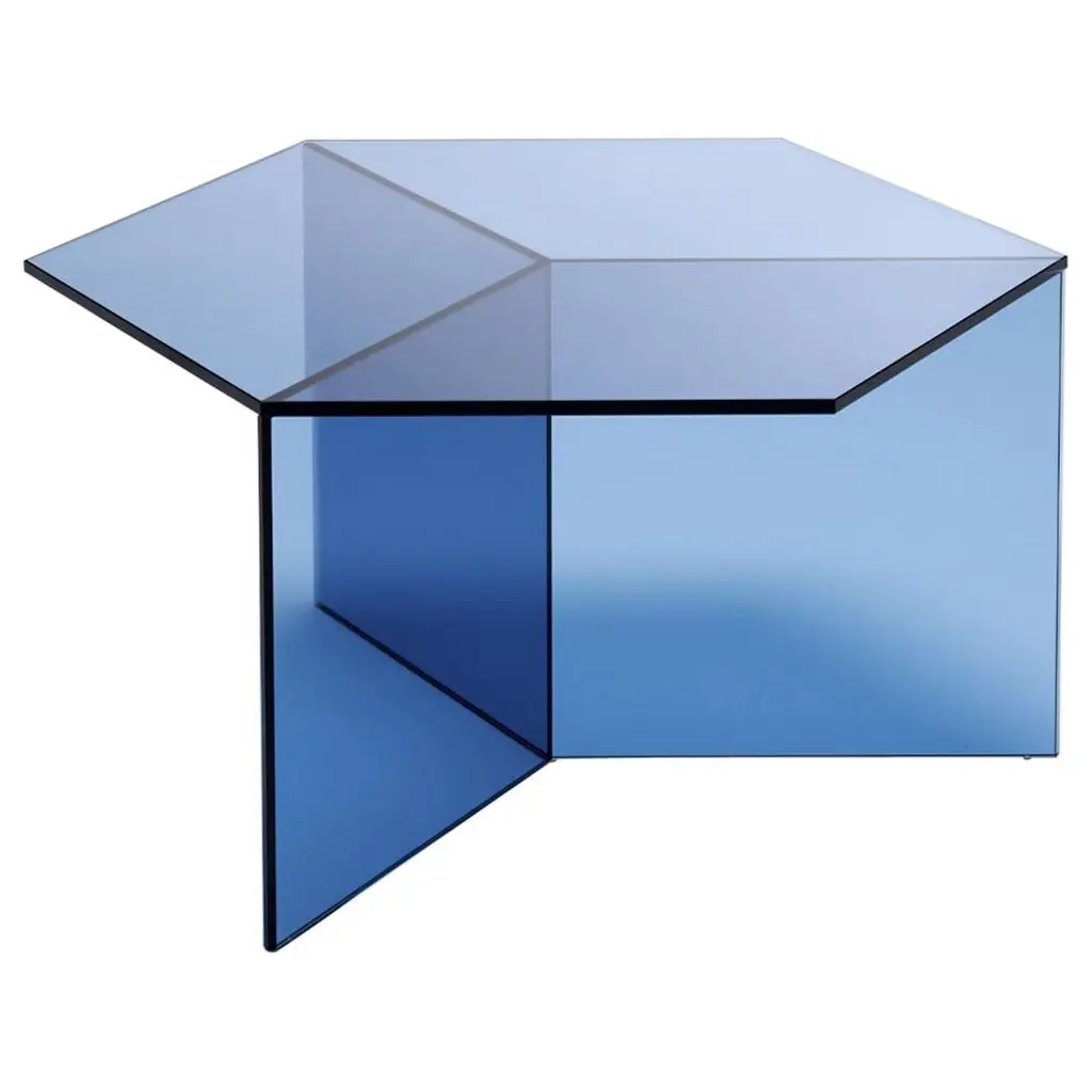 Satin glass "Isom Oblong" coffee table - Sebastian SchererDimensions: 35 H x 105 W x 61 D cmMaterials: Solid coloured glassDifferent colors and sizes are availableThe Isom tables play with a fascinating optical illusion. The hexagonal glass panel is UV glued with three vertical foot elements whose edges, viewed from a certain angle, convey the perfect isometric drawing of a cube. A special detail are the CNC-ground double mitres and the seamless bonding of the foot elements. The different sizes and variants can be combined very well. The glass tables are available in four colours, each in clear glass and satined.The NEO/CRAFT label was founded by the Berlin-based designer Sebastian Scherer after he won the Lexus Design Award 2014 for his Iris lamp (2013). The debut collection, which consisted of ten products, was first presented at the imm cologne in January 2015 in what Wallpaper Magazine described as “one of the most impressive debuts in 2015.” Exhibitions at trade fairs in Milan and London followed this same year. Since then, Sebastian Scherer has worked as a designer and creative director in equal measure. The collection consists of his designs, but these can also undergo further development in the future through the input of other designers. The central element in his developmental process is the continual search for new creative possibilities with classical materials such as aluminum, steel, glass and wood.