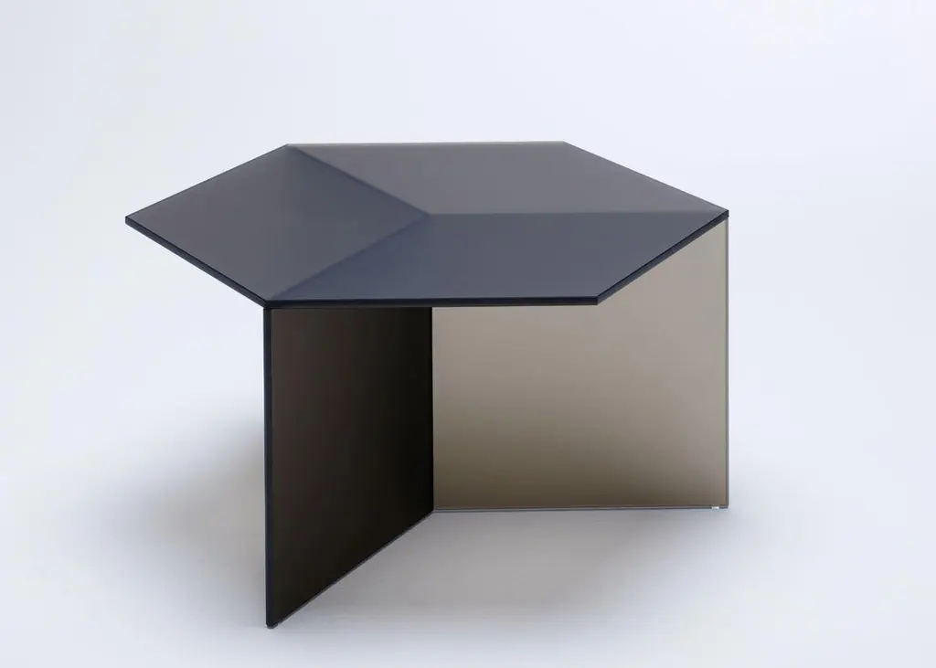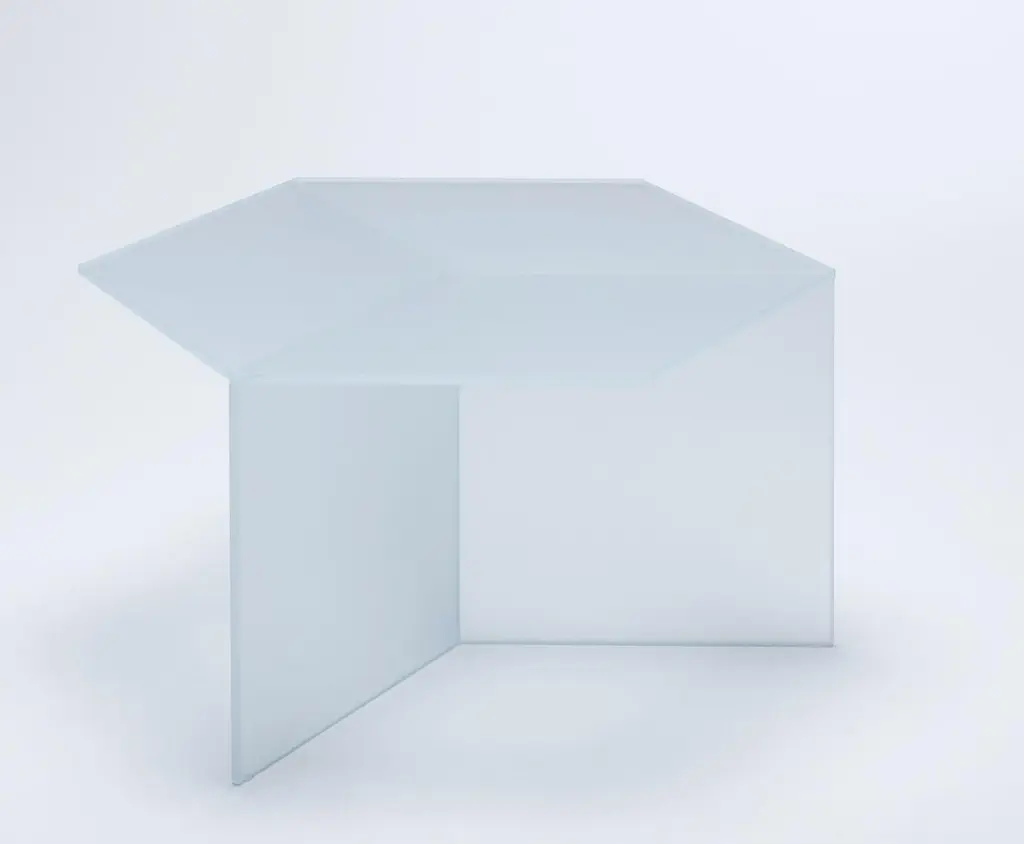 Satin glass "Isom Square" coffee table, Sebastian SchererDimensions: 80 x 69 x 40 cmMaterials: Solid colored glassDifferent colors and sizes are availableThe Isom tables play with a fascinating optical illusion. The hexagonal glass panel is UV glued with three vertical foot elements whose edges, viewed from a certain angle, convey the perfect isometric drawing of a cube. A special detail are the CNC-ground double mitres and the seamless bonding of the foot elements. The different sizes and variants can be combined very well. The glass tables are available in four colors, each in clear glass and satined.The NEO/CRAFT label was founded by the Berlin-based designer Sebastian Scherer after he won the Lexus Design Award 2014 for his Iris lamp (2013). The debut collection, which consisted of ten products, was first presented at the imm cologne in January 2015 in what Wallpaper Magazine described as “one of the most impressive debuts in 2015.” Exhibitions at trade fairs in Milan and London followed this same year. Since then, Sebastian Scherer has worked as a designer and creative director in equal measure. The collection consists of his designs, but these can also undergo further development in the future through the input of other designers. The central element in his developmental process is the continual search for new creative possibilities with classical materials such as aluminum, steel, glass and wood.