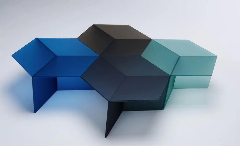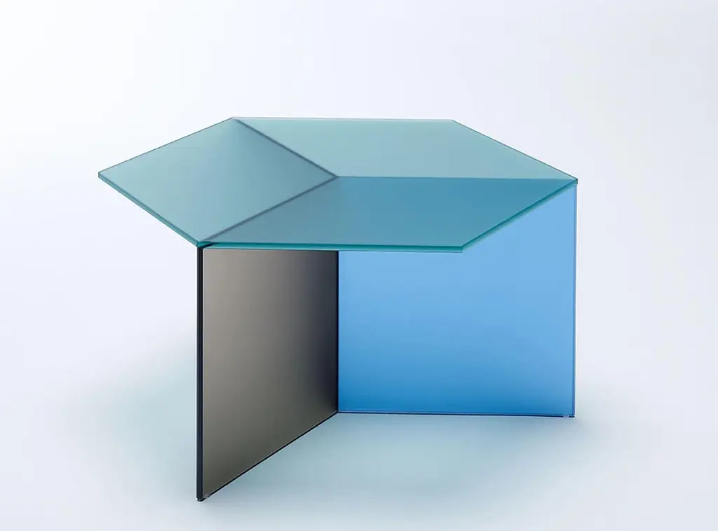 Satin glass "Isom Square" coffee table, Sebastian Scherer.Dimensions: 40 H x 80 W x 69 D cm.Materials: Solid coloured glass.Different colors and sizes are available.The Isom tables play with a fascinating optical illusion. The hexagonal glass panel is UV glued with three vertical foot elements whose edges, viewed from a certain angle, convey the perfect isometric drawing of a cube. A special detail are the CNC-ground double mitres and the seamless bonding of the foot elements. The different sizes and variants can be combined very well. The glass tables are available in four colors, each in clear glass and satined.The NEO/CRAFT label was founded by the Berlin-based designer Sebastian Scherer after he won the Lexus Design Award 2014 for his Iris lamp (2013). The debut collection, which consisted of ten products, was first presented at the imm cologne in January 2015 in what Wallpaper Magazine described as “one of the most impressive debuts in 2015.” Exhibitions at trade fairs in Milan and London followed this same year. Since then, Sebastian Scherer has worked as a designer and creative director in equal measure. The collection consists of his designs, but these can also undergo further development in the future through the input of other designers. The central element in his developmental process is the continual search for new creative possibilities with classical materials such as aluminum, steel, glass and wood.