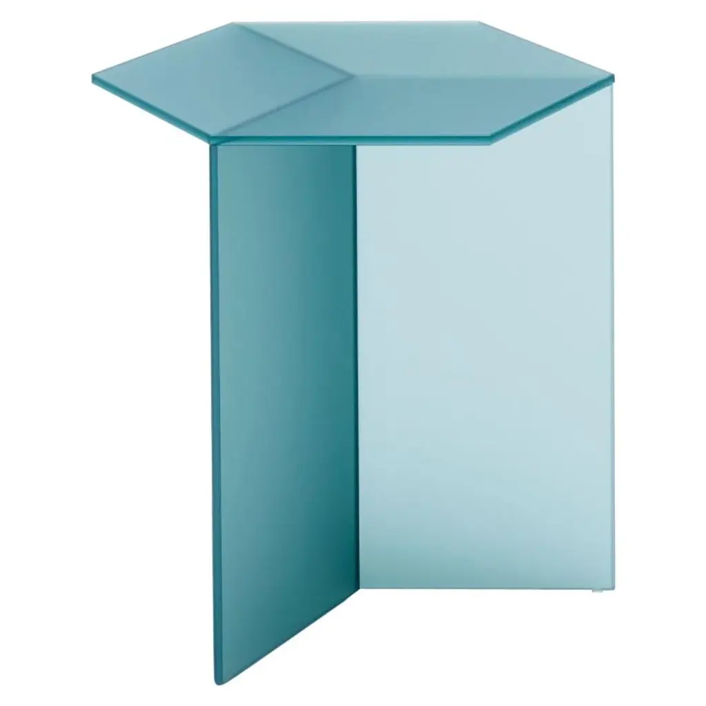 Satin glass "Isom Tall" coffee table, Sebastian SchererDimensions: 50 H x 43 W x 50 D cmMaterials: Solid colored glassDifferent colors and sizes are availableThe Isom tables play with a fascinating optical illusion. The hexagonal glass panel is UV glued with three vertical foot elements whose edges, viewed from a certain angle, convey the perfect isometric drawing of a cube. A special detail are the CNC-ground double mitres and the seamless bonding of the foot elements. The different sizes and variants can be combined very well. The glass tables are available in four colours, each in clear glass and satined.The NEO/CRAFT label was founded by the Berlin-based designer Sebastian Scherer after he won the Lexus Design Award 2014 for his Iris lamp (2013). The debut collection, which consisted of ten products, was first presented at the imm cologne in January 2015 in what Wallpaper Magazine described as “one of the most impressive debuts in 2015.” Exhibitions at trade fairs in Milan and London followed this same year. Since then, Sebastian Scherer has worked as a designer and creative director in equal measure. The collection consists of his designs, but these can also undergo further development in the future through the input of other designers. The central element in his developmental process is the continual search for new creative possibilities with classical materials such as aluminum, steel, glass and wood.