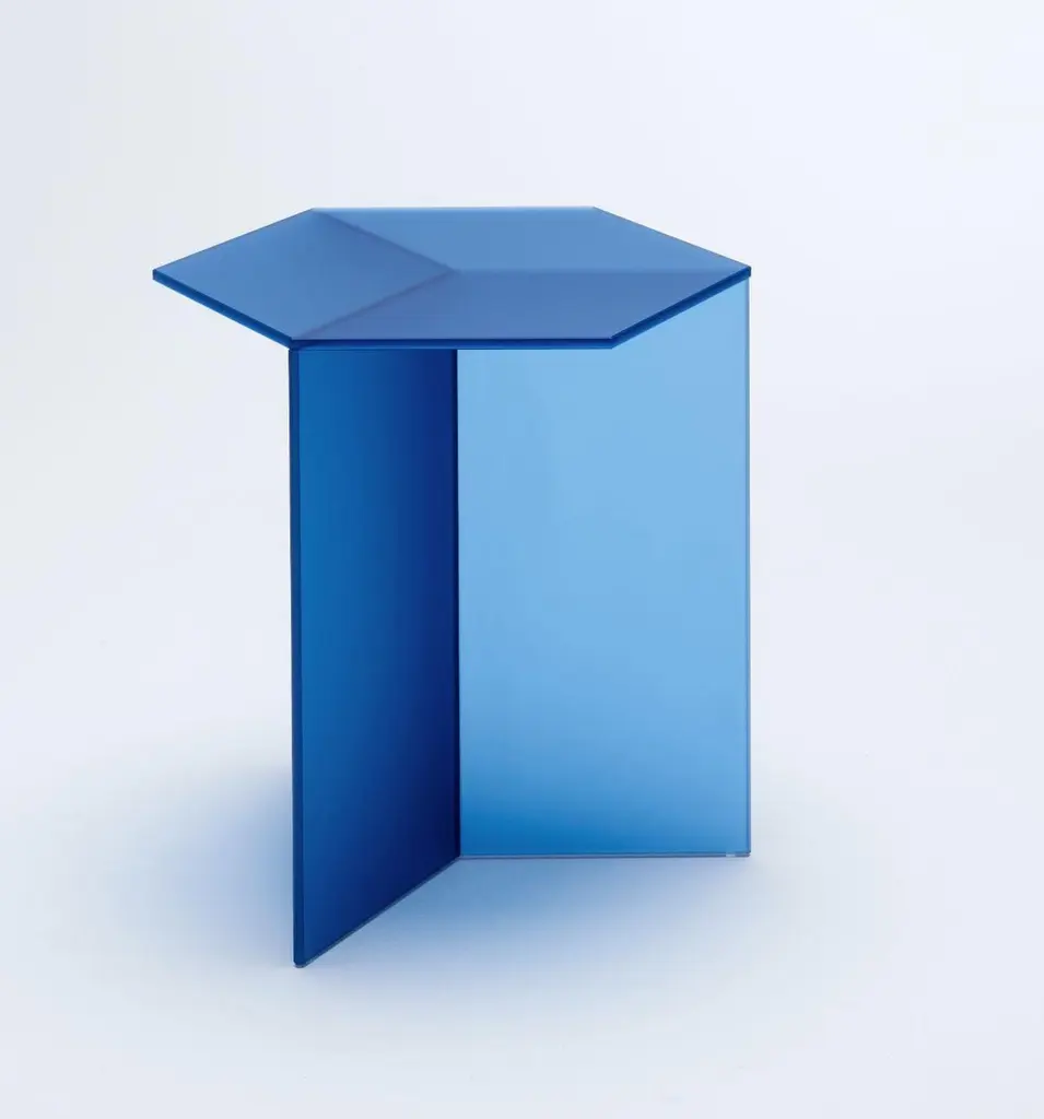 Satin glass "Isom Tall" coffee table - Sebastian SchererDimensions: 45 H x 39 W x 45 D cmMaterials: Solid colored glassDifferent colors and sizes are availableThe Isom tables play with a fascinating optical illusion. The hexagonal glass panel is UV glued with three vertical foot elements whose edges, viewed from a certain angle, convey the perfect isometric drawing of a cube. A special detail are the CNC-ground double mitres and the seamless bonding of the foot elements. The different sizes and variants can be combined very well. The glass tables are available in four colors, each in clear glass and satined.The NEO/CRAFT label was founded by the Berlin-based designer Sebastian Scherer after he won the Lexus Design Award 2014 for his Iris lamp (2013). The debut collection, which consisted of ten products, was first presented at the imm cologne in January 2015 in what Wallpaper Magazine described as “one of the most impressive debuts in 2015.” Exhibitions at trade fairs in Milan and London followed this same year. Since then, Sebastian Scherer has worked as a designer and creative director in equal measure. The collection consists of his designs, but these can also undergo further development in the future through the input of other designers. The central element in his developmental process is the continual search for new creative possibilities with classical materials such as aluminum, steel, glass and wood.