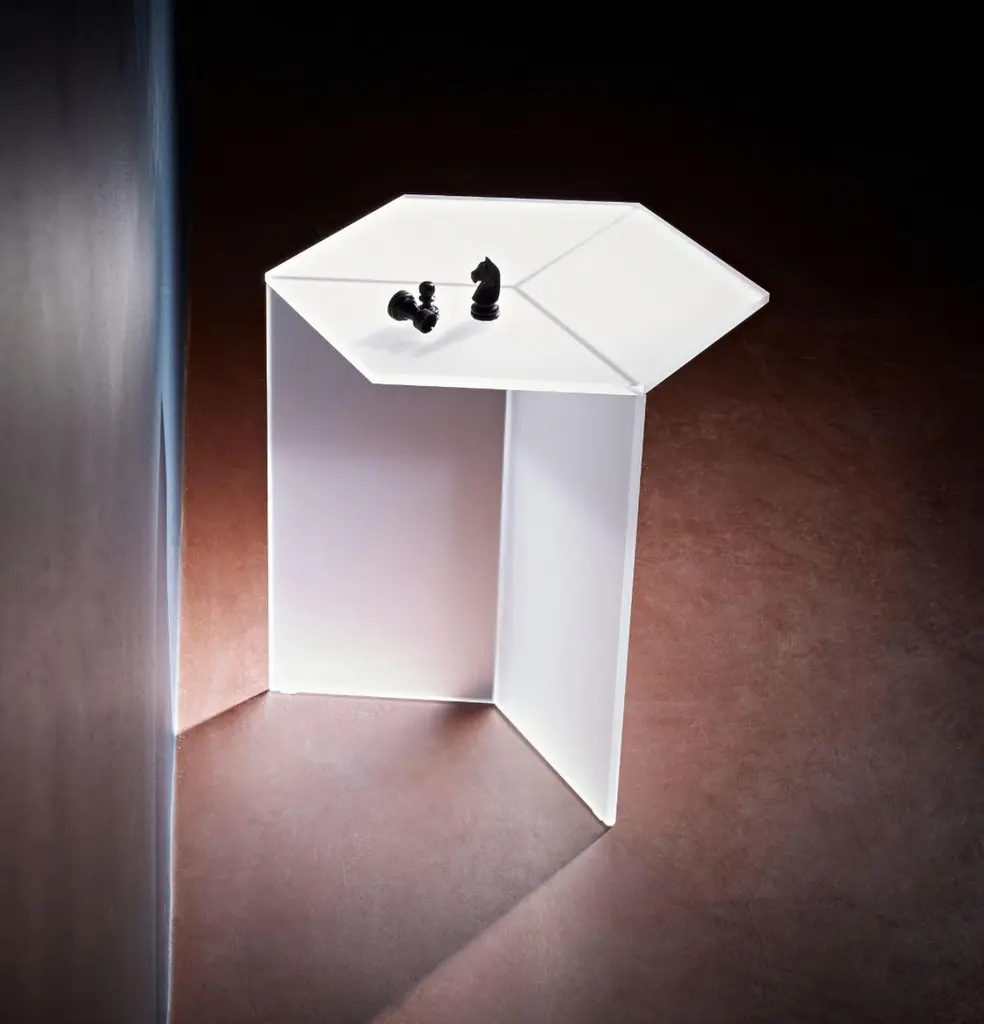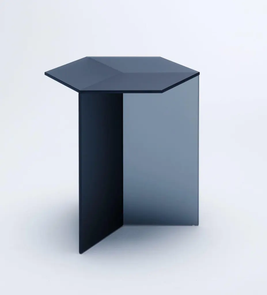 Satin glass "Isom Tall" coffee table, Sebastian SchererDimensions: 45 H x 39 W x 45 D cmMaterials: Solid colored glassDifferent colors and sizes are availableThe Isom tables play with a fascinating optical illusion. The hexagonal glass panel is UV glued with three vertical foot elements whose edges, viewed from a certain angle, convey the perfect isometric drawing of a cube. A special detail are the CNC-ground double mitres and the seamless bonding of the foot elements. The different sizes and variants can be combined very well. The glass tables are available in four colors, each in clear glass and satined.The NEO/craft label was founded by the Berlin-based designer Sebastian Scherer after he won the Lexus Design Award 2014 for his Iris lamp, (2013). The debut collection, which consisted of ten products, was first presented at the imm cologne in January 2015 in what Wallpaper Magazine described as “one of the most impressive debuts in 2015.” Exhibitions at trade fairs in Milan and London followed this same year. Since then, Sebastian Scherer has worked as a designer and creative director in equal measure. The collection consists of his designs, but these can also undergo further development in the future through the input of other designers. The central element in his developmental process is the continual search for new creative possibilities with classical materials such as aluminum, steel, glass and wood.