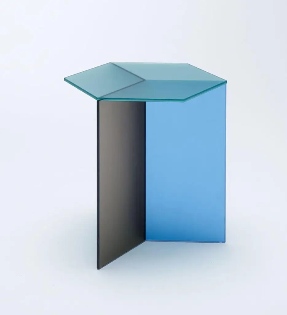 Satin glass "Isom Tall" coffee table - Sebastian SchererDimensions: 45 H x 39 W x 45 D cmMaterials: Solid colored glassDifferent colors and sizes are availableThe Isom tables play with a fascinating optical illusion. The hexagonal glass panel is UV glued with three vertical foot elements whose edges, viewed from a certain angle, convey the perfect isometric drawing of a cube. A special detail are the CNC-ground double mitres and the seamless bonding of the foot elements. The different sizes and variants can be combined very well. The glass tables are available in four colors, each in clear glass and satined.The NEO/CRAFT label was founded by the Berlin-based designer Sebastian Scherer after he won the Lexus Design Award 2014 for his Iris lamp (2013). The debut collection, which consisted of ten products, was first presented at the imm cologne in January 2015 in what Wallpaper Magazine described as “one of the most impressive debuts in 2015.” Exhibitions at trade fairs in Milan and London followed this same year. Since then, Sebastian Scherer has worked as a designer and creative director in equal measure. The collection consists of his designs, but these can also undergo further development in the future through the input of other designers. The central element in his developmental process is the continual search for new creative possibilities with classical materials such as aluminum, steel, glass and wood.