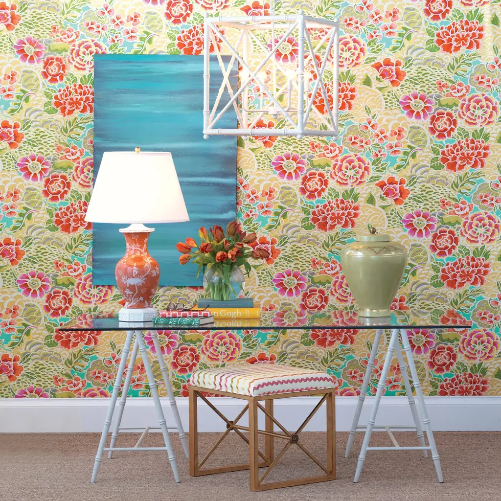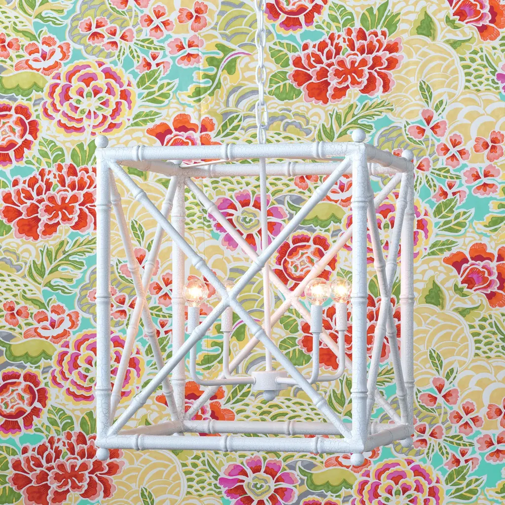 The Baldwin chandelier by Scalamandre Maison for Port 68 was designed to coordinate with the Baldwin sconces and table.The shape was inspired by the iconic Scalamandre wallpaper "Baldwin Bamboo"--a favorite of decorator Billy Baldwin. The Baldwin chandelier is made from metal shaped bamboo, and is available in hand burnished gold leaf or an aged white finish.