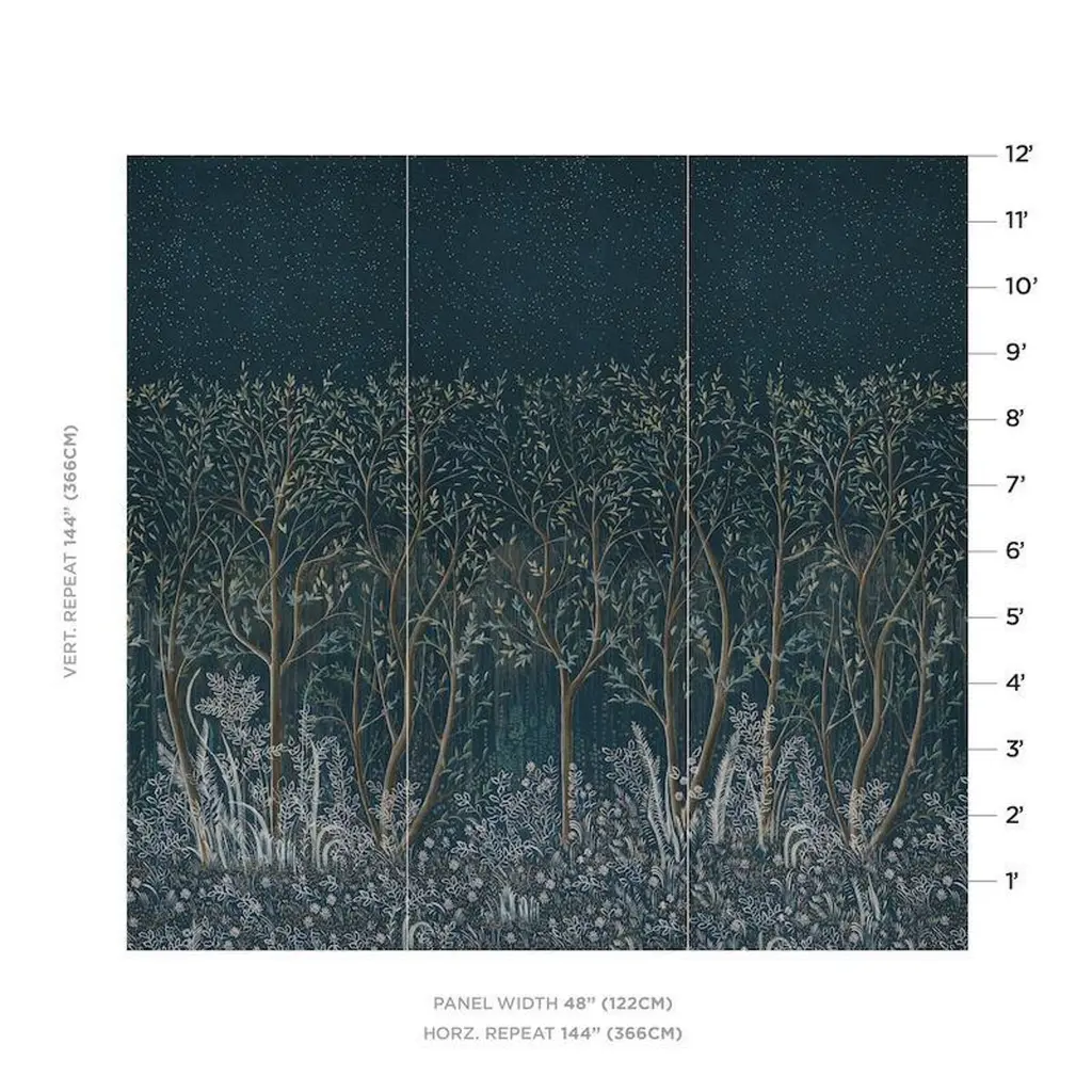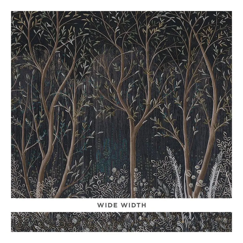 In artist Colette Cosentino's fantastical dreamscape of a forest, multi-layered applications of acrylic and metallic paints accumulate into a dark, almost foreboding moodiness. A digital print with gold accents in three non-repeating panels recreates the textural artwork. Panel Width: 48" Overall Dimensions: 144" W x 143 2/3" H Samples are available upon request.