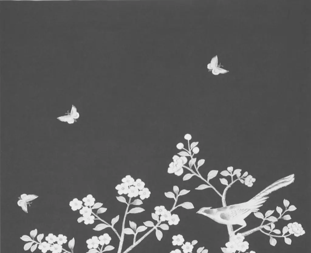 Inspired by an antique Chinese silk panel, this design features exotic birds and cherry blossoms and is true to the original scale. Available as a printed linen and a wallcovering.Panel Width: 51 3/4" Overall Dimensions: 51 3/4" W x 144" H Samples are available upon request.