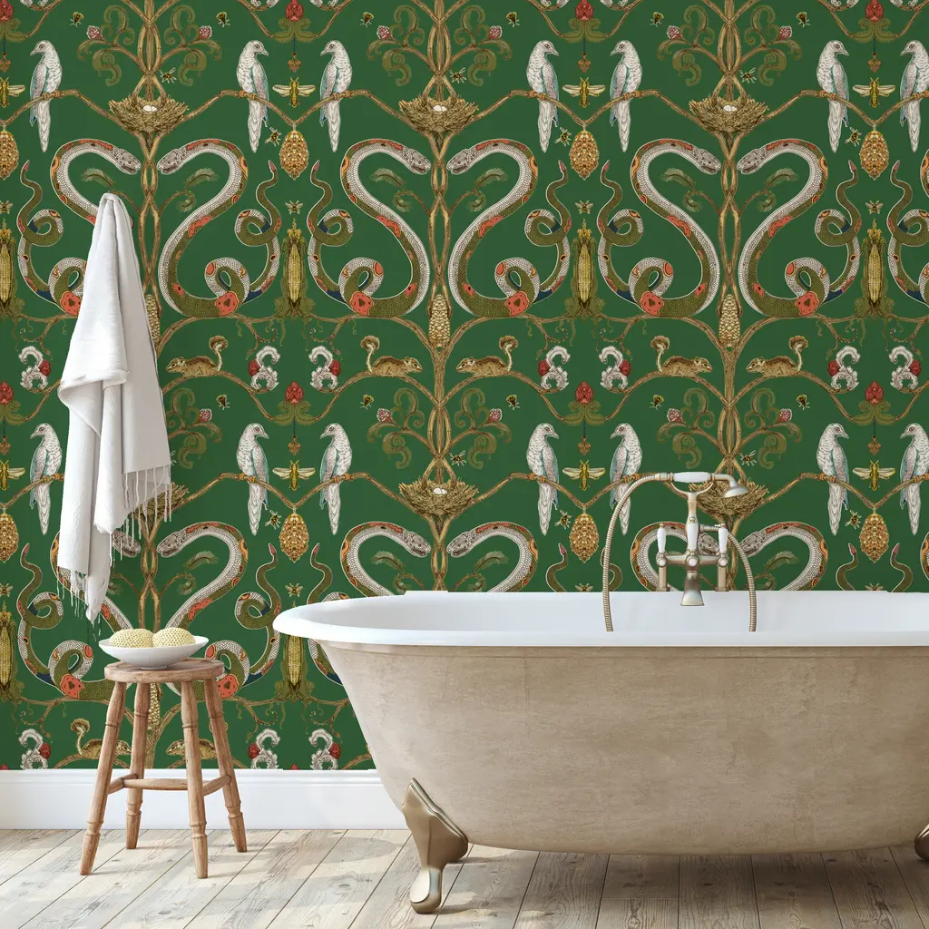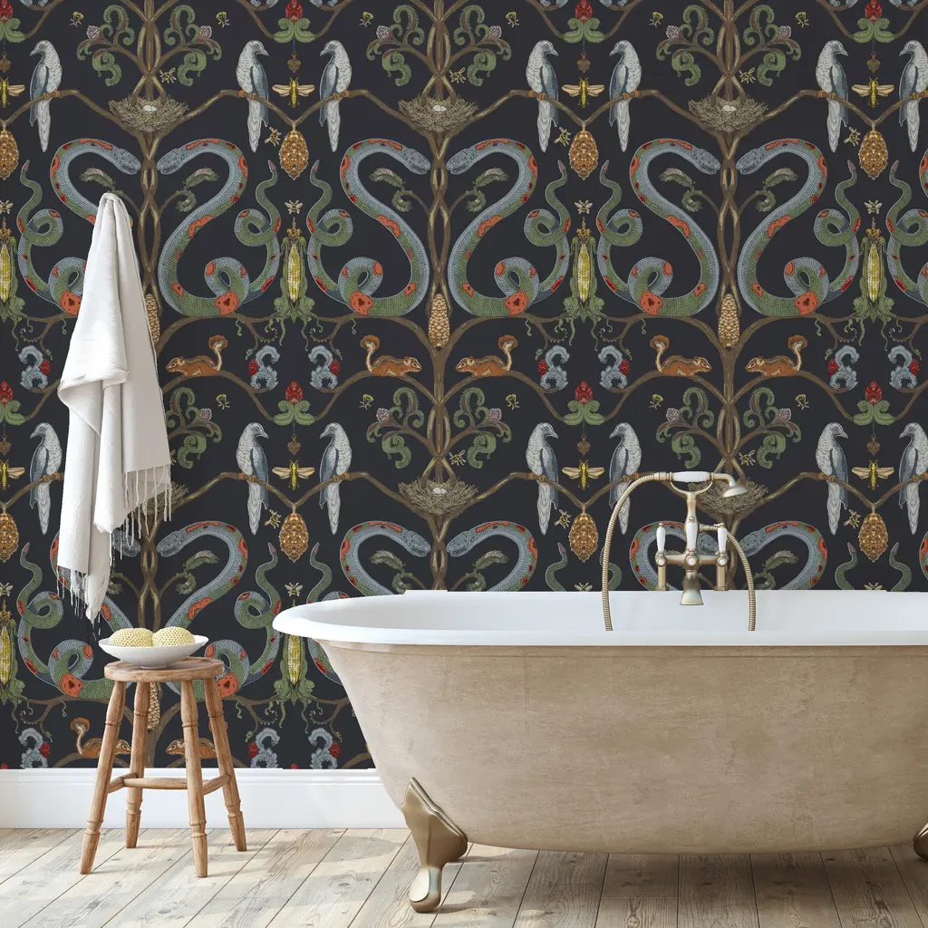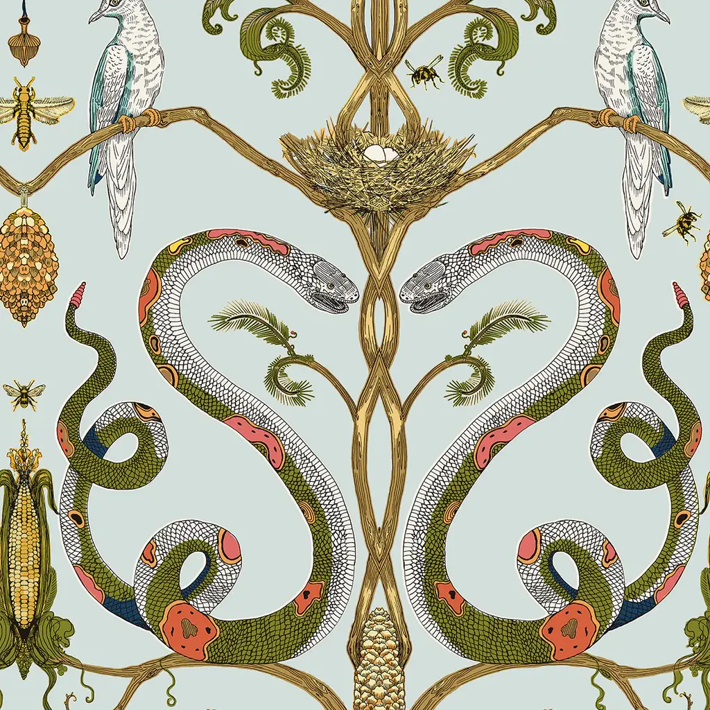 Hand drawn during the Year of the Snake and updated with vibrant, painted colorways, the Snake Party 2.0 Wallpaper from Merenda is composed to create a mirrored, harmonious pattern that is sure to enliven all interior walls. Featuring a repeating pattern of colorful snakes, chipmunks, birds, and beetles, this eye-catching wallpaper offers an elegant, yet unexpected print perfect for bedrooms, dining rooms, walk-in closets, and living spaces.Highlights Note: