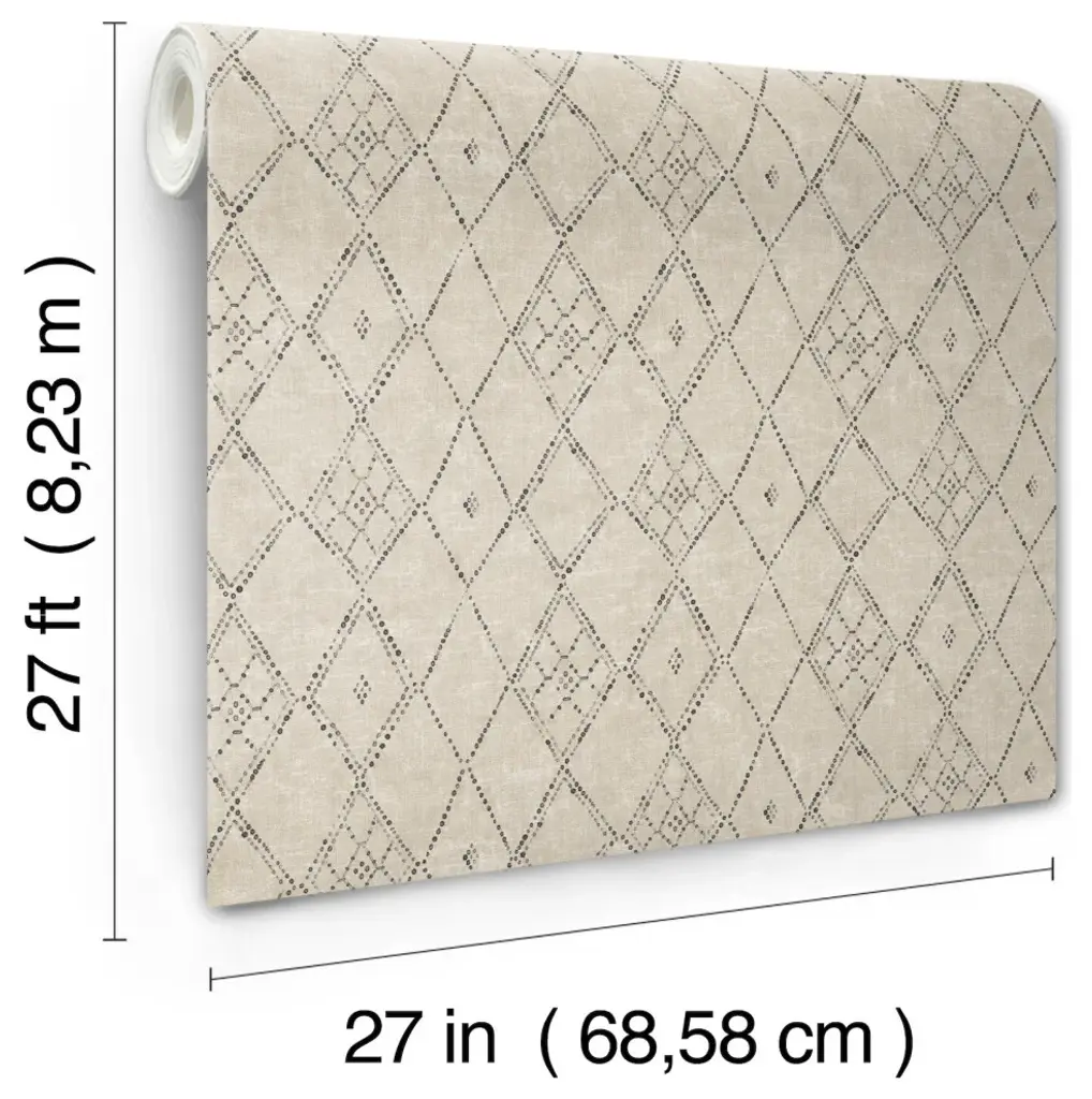 The natural dye and handpainted style of Souk Diamonds depicts the beautiful loomed woven of organic linens found in tribal open-air markets, shown in taupe brown with charcoal grey. This Souk Diamonds Wallpaper measures approximately 27 inches wide by 27 feet long, measuring approximately 60.8 square feet per roll. A retrospective from the private collections of Christiane Lemieux featuring global, artistic and handcrafted designs. Unpasted non woven material; 20.5-in repeat, straight match; Washable and strippable; 27-in by 27-ft long roll; Covers about 60.8 square feet