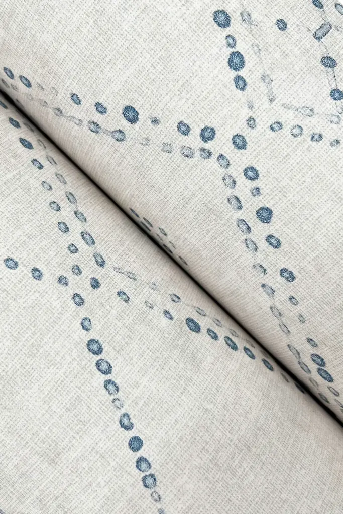 The natural dye and handpainted style of Souk Diamonds depicts the beautiful loomed woven of organic linens found in tribal open-air markets, shown in taupe brown and denim blue.