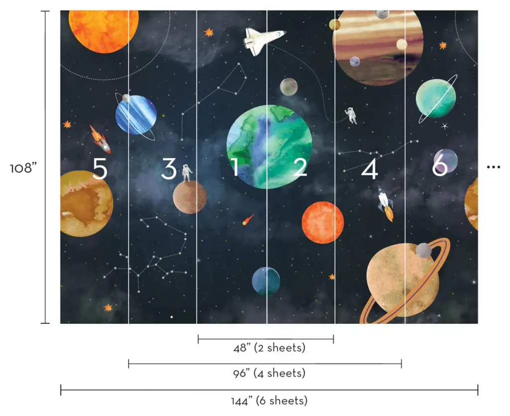 The overall pattern repeats every 6 sheets. Purchase as many sheets as you need for the space. This mural is sold in 2 sheet sets. For example, if you have a wall that is 7 feet wide, you would need to order 4 sheet set (you will receive sheets 1 through 4 as shown in the illustrated diagram).Size Options:24"w x 108"hSet of 2 sheets covers up to 4 ft in wall width. Set of 4 sheets covers up to 8 ft in wall width. Set of 6 sheets covers up to 12 ft in wall width. What''s Included:Sold in sets of 2. You may choose to buy 2, 4, or 6 Vinyl wallpaper sheets at a time.