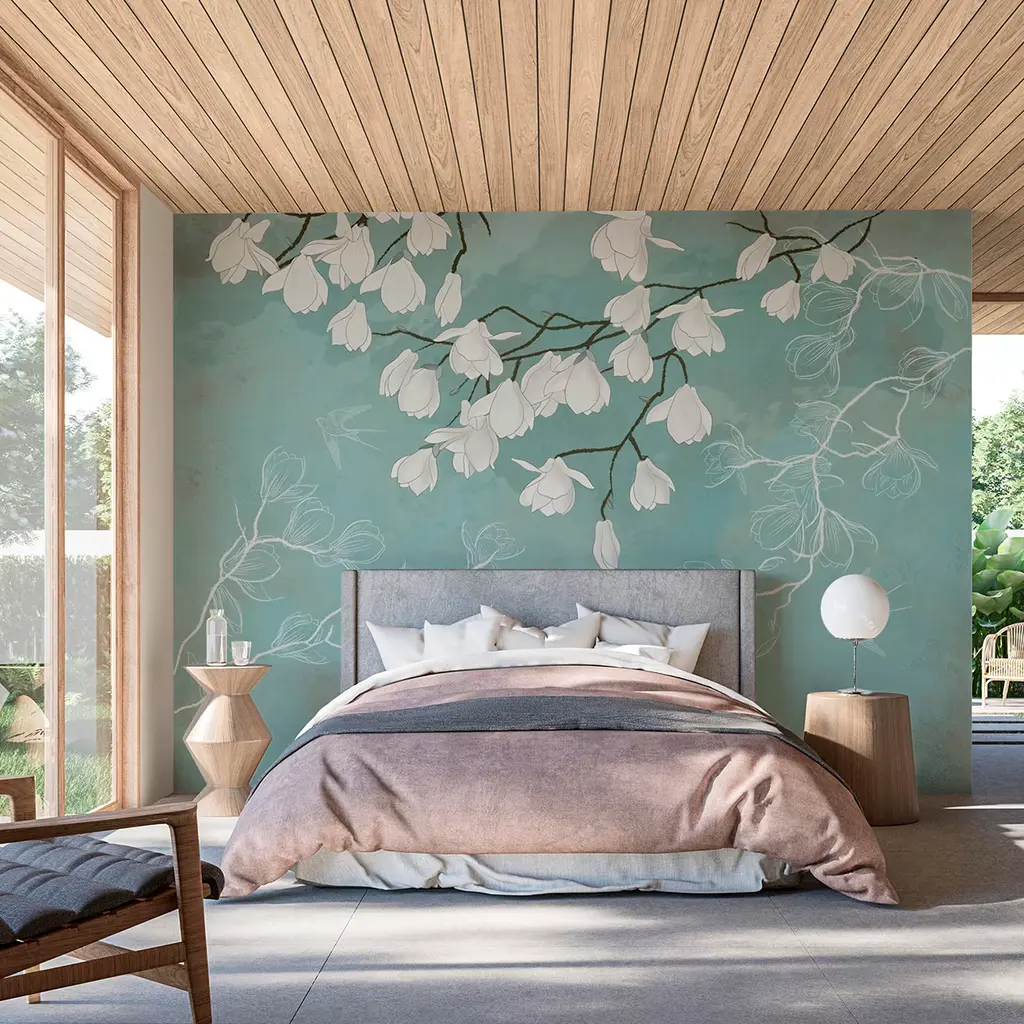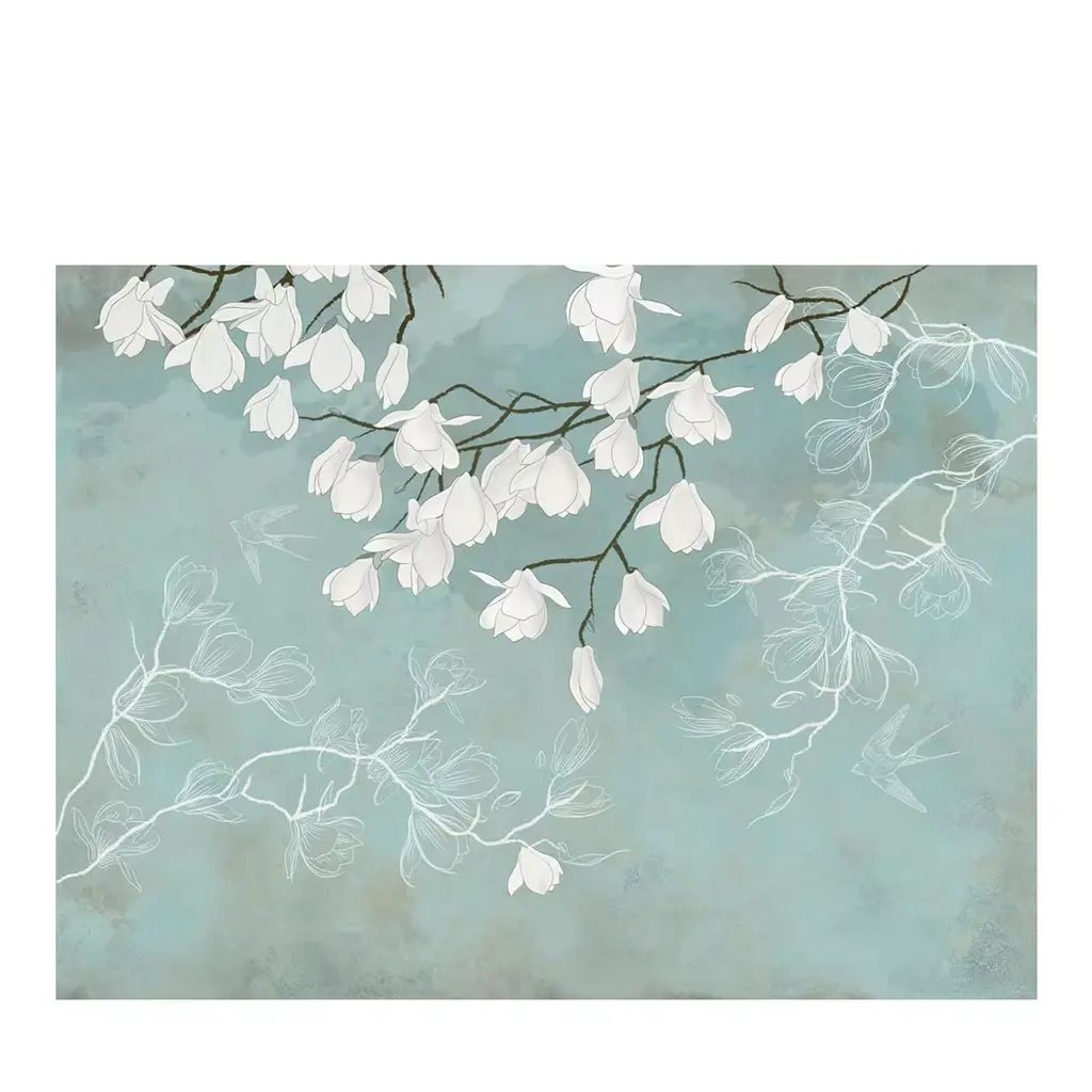 A calm and peaceful representation of spring through which one can almost hear the joyful chirping of swallows and branches delicately dancing along with the wind, this stupendous wallpaper will infuse a modern interior with a cheerful and dreamy ambiance. Fashioned of cellulose, textile fibers, and vinyl, it is fireproof, unscented, breathable, and hypoallergenic. Also available made of fiberglass or in the ECO version upon request to the Concierge. The price is per squared meter.