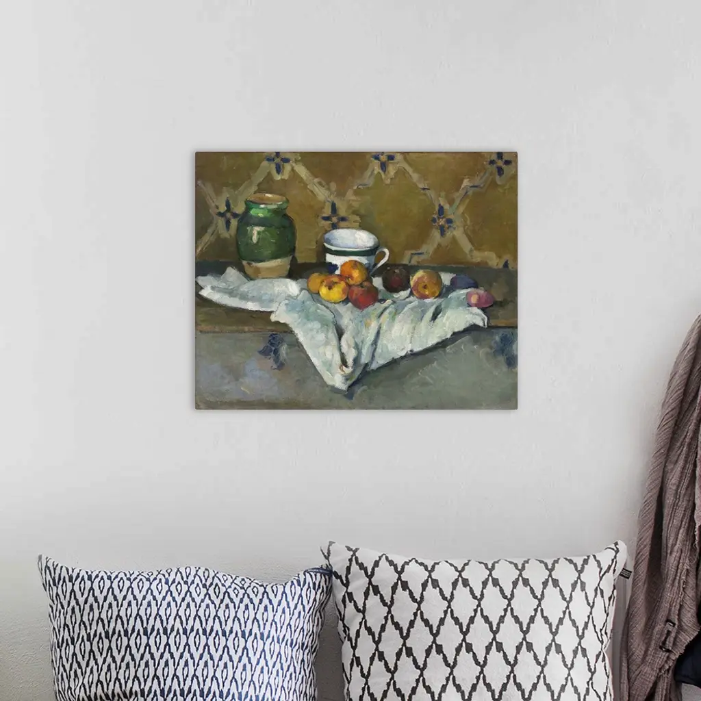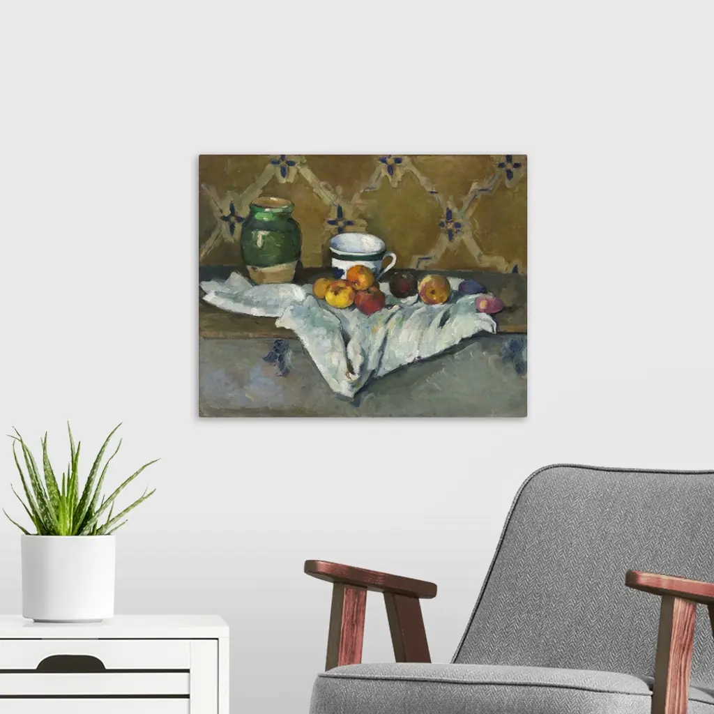 In addition to apples-a favorite motif of Cezanne's-the ceramic jar and cup seen in this still life feature in numerous paintings by the artist. The wallpaper in the background appears in six works that he painted about 1877, when he rented an apartment at 67 rue de l'Ouest, Paris. Its pattern is echoed both by the shape of the white cloth on which the everyday items are arranged and by the painted floral decoration on the front of the wooden chest.